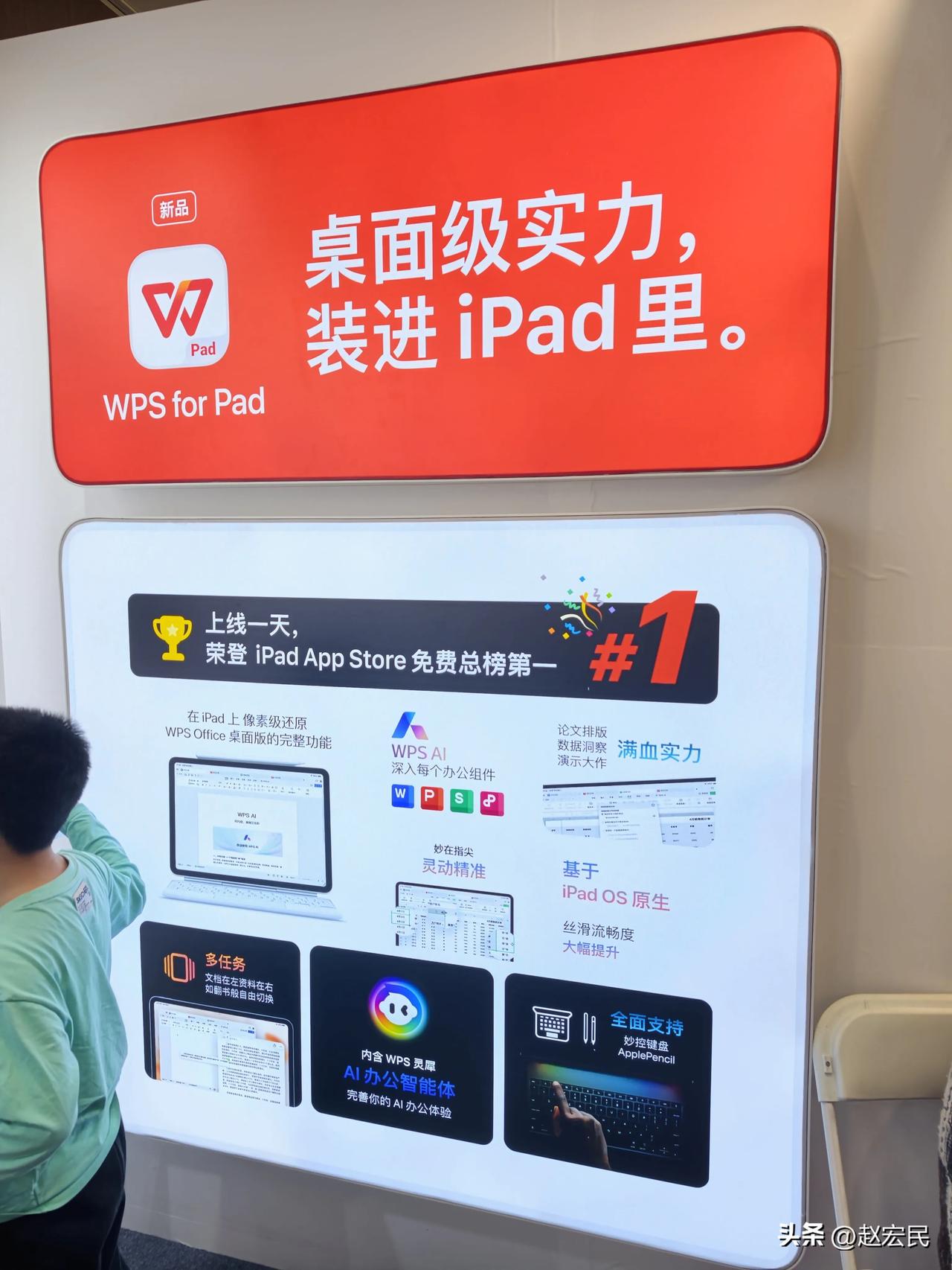 3月29日,宏民在上海漕河泾会议中心参加了 LET'S VISION 2026 Apple生态开发者大会。 我们常说,AI时代所有产品都值得用 AI 重做一遍,在这场大会上,我看到了这句话的极致体现。 我是一位科技博主,平时工作对电脑、手机、平板非常的依赖,特别要出差赶稿、现场出稿是家常便饭,对用平板办公,更是刚需。我在WPS展台,找到了提升效率的密码。 比如苹果的iPad,买之前我们对他寄予厚望,买前生产力,想让它成为我们出差中的电脑,但买后却沦为买后播放器。 微软Office iPad版的适配真的堪称拉垮,说白了就是个大号手机,功能是阉割过的,只能看看文档、改两个错别字,数据透视表找不到入口,LaTeX 公式根本不支持,那些真正强悍的功能,微软是不舍得往平板上用啊。 其实站在微软的角度,也很好理解,他把Office iPad版做的那么好用,谁还买他的 Windows啊。 而WPS for Pad版,只用一个逻辑,那就是和电脑端一样,他们基于iPadOS原生开发的,界面、顶部菜单栏、快捷键都和桌面版完全一致。 没有任何不适。 之前我们总觉得,平板是电脑的配角,干不了重活,但今天实测我发现,根本不是这么回事,虽然电脑端有键盘鼠标,但iPad可以外接接上妙控键盘,而且iPad还有一个电脑比不了的优势,那就是触控交互,用我们的手指操作编辑文档,比鼠标还溜。 还有WPS灵犀AI,它的入口也非常明显,大白话互动操作、AI润色文档、AI校对错别字,直接上传文档就能一键生成完整的PPT,生成之后还能边聊边改,语音输入就能搞定,这是一个真正的生产力工具。 所以你看,电脑能干的重活它全能干,电脑没有的触控、手写、便携、语音优势它全有,这样的WPS for Pad哪里是配角? 这明明是和电脑旗鼓相当,甚至在移动办公场景里,比电脑还能打的主力工具。” 甚至于我感觉,有了像WPS for Pad这样的应用,iPad的销量都得提升一些。 这些年我们总说办公软件国产平替,但在WPS展台我们会发现,在手机移动端WPS早就实现了对微软的弯道超车,如今的WPS for Pad,应该说是WPS在对自我进行超越。 WPS for Pad是国内外 iPadOS 生态中首个桌面级 Office 应用。而且界面布局和操作逻辑,更贴近电脑端使用习惯,更完整功能和更清晰的功能入口。 微软十年都没给iPad用户解决的痛点,我们中国自己的办公软件,做到了。 从今天起,iPad「买前生产力,买后播放器」的魔咒,真的可以彻底破了。
