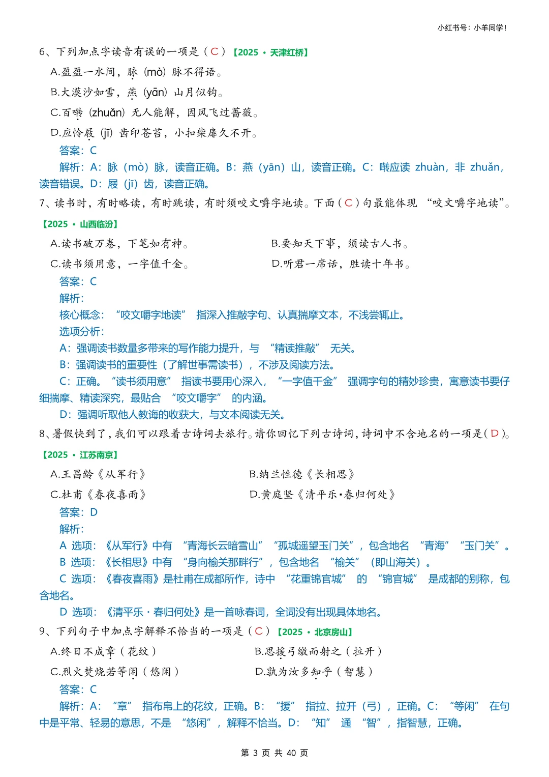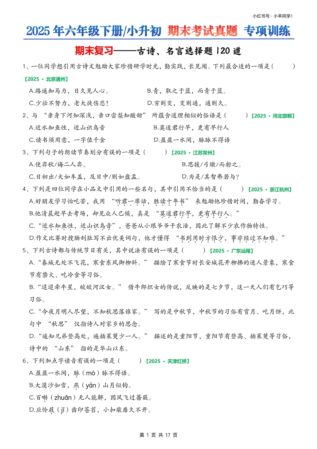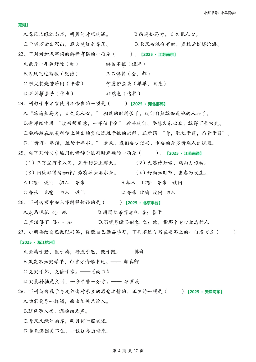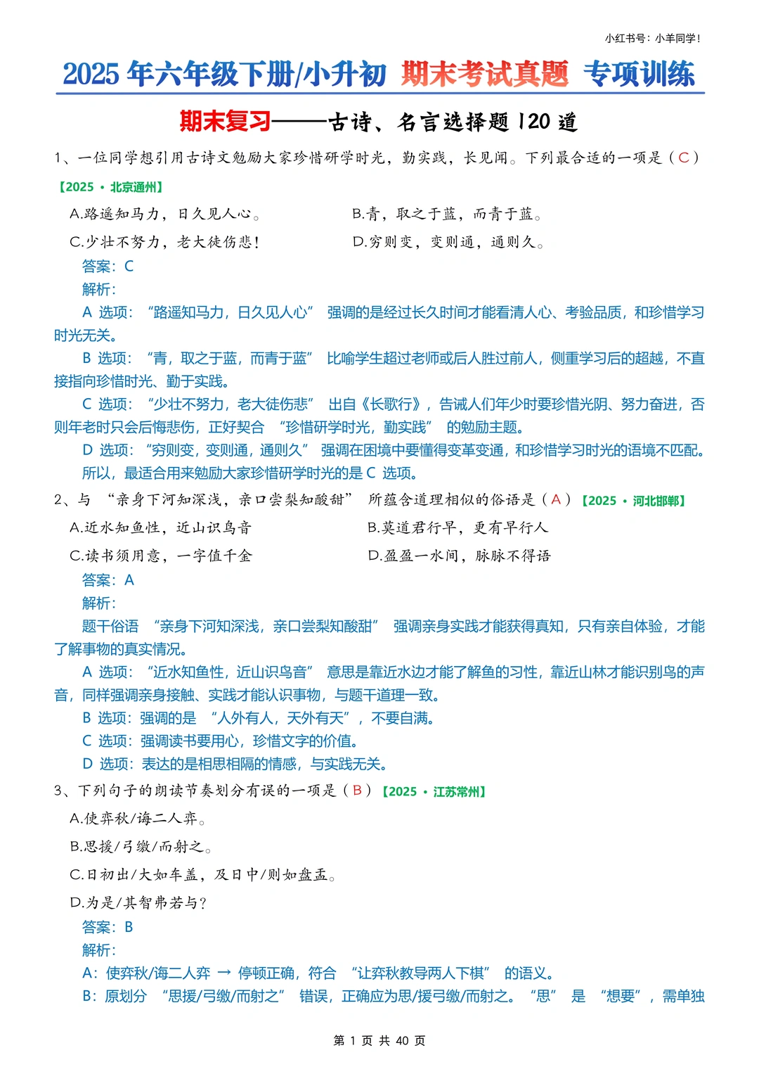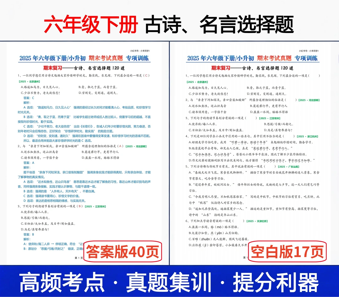 是以2025年各地区期末或小升初真题试卷整理,期中理解性选择较多,对古诗的理解足够透彻,方可错误遗漏,不然很容易出错。