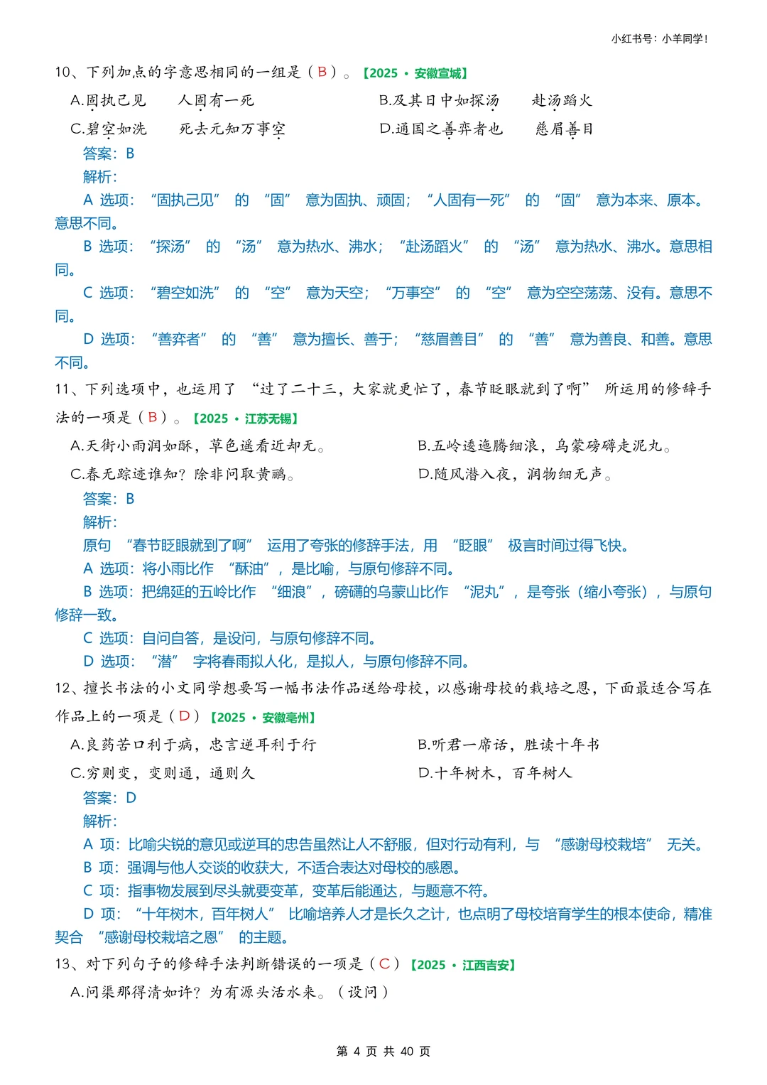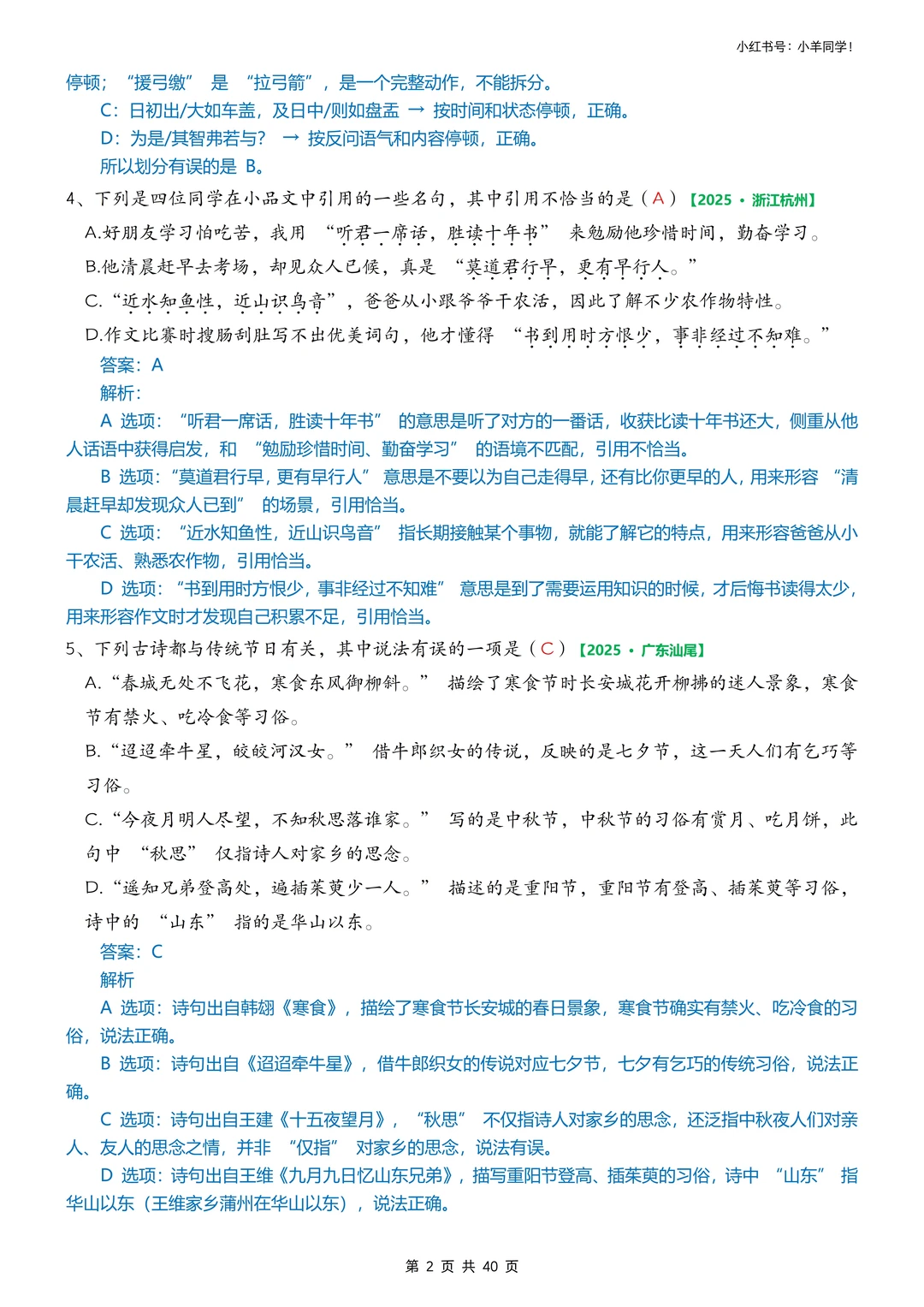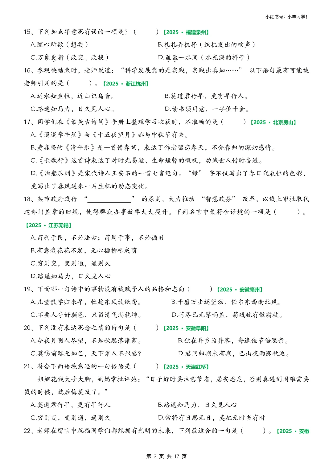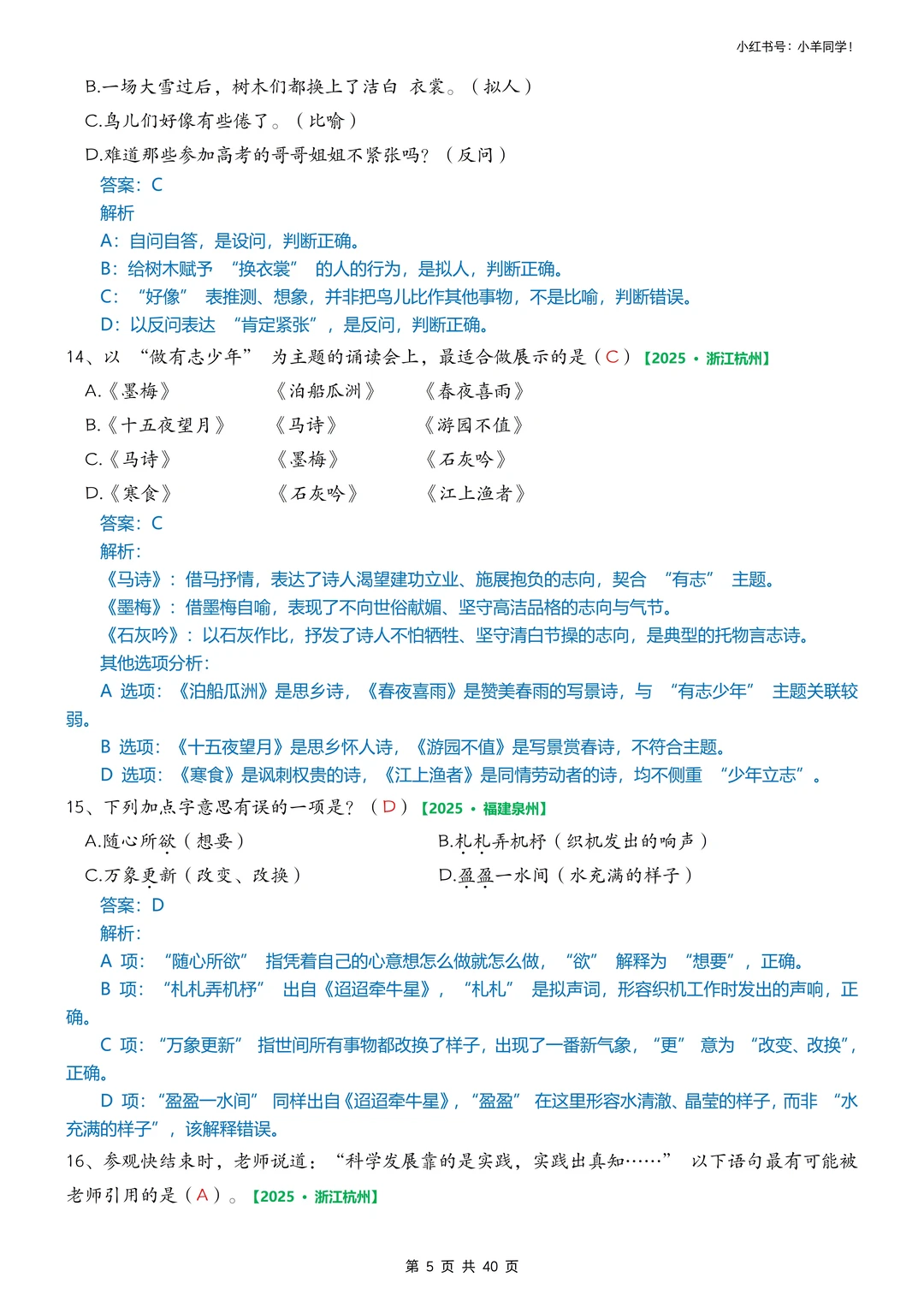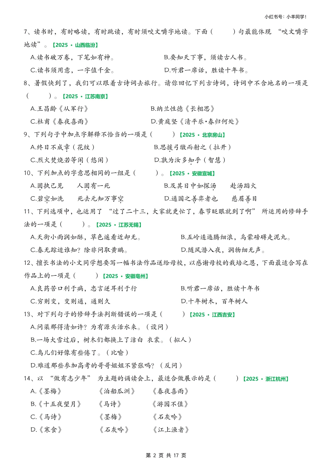是以2025年各地区期末或小升初真题试卷整理,期中理解性选择较多,对古诗的理解足够透彻,方可错误遗漏,不然很容易出错。