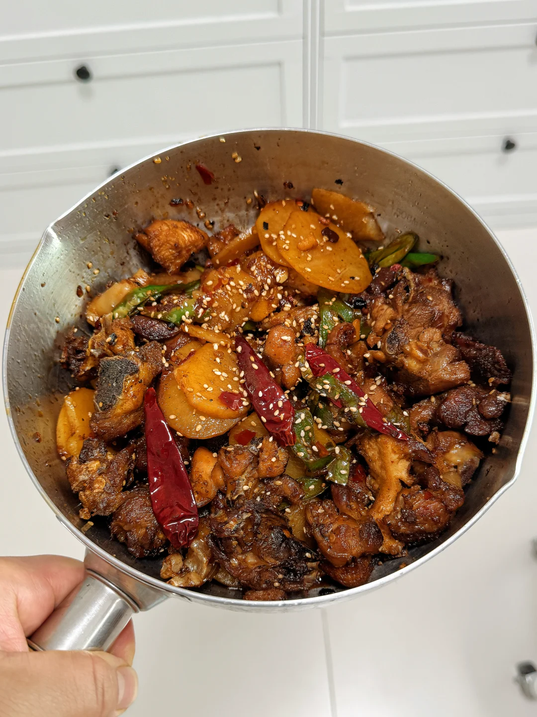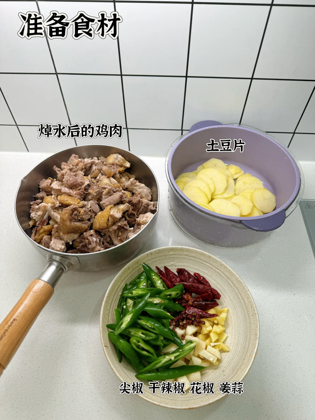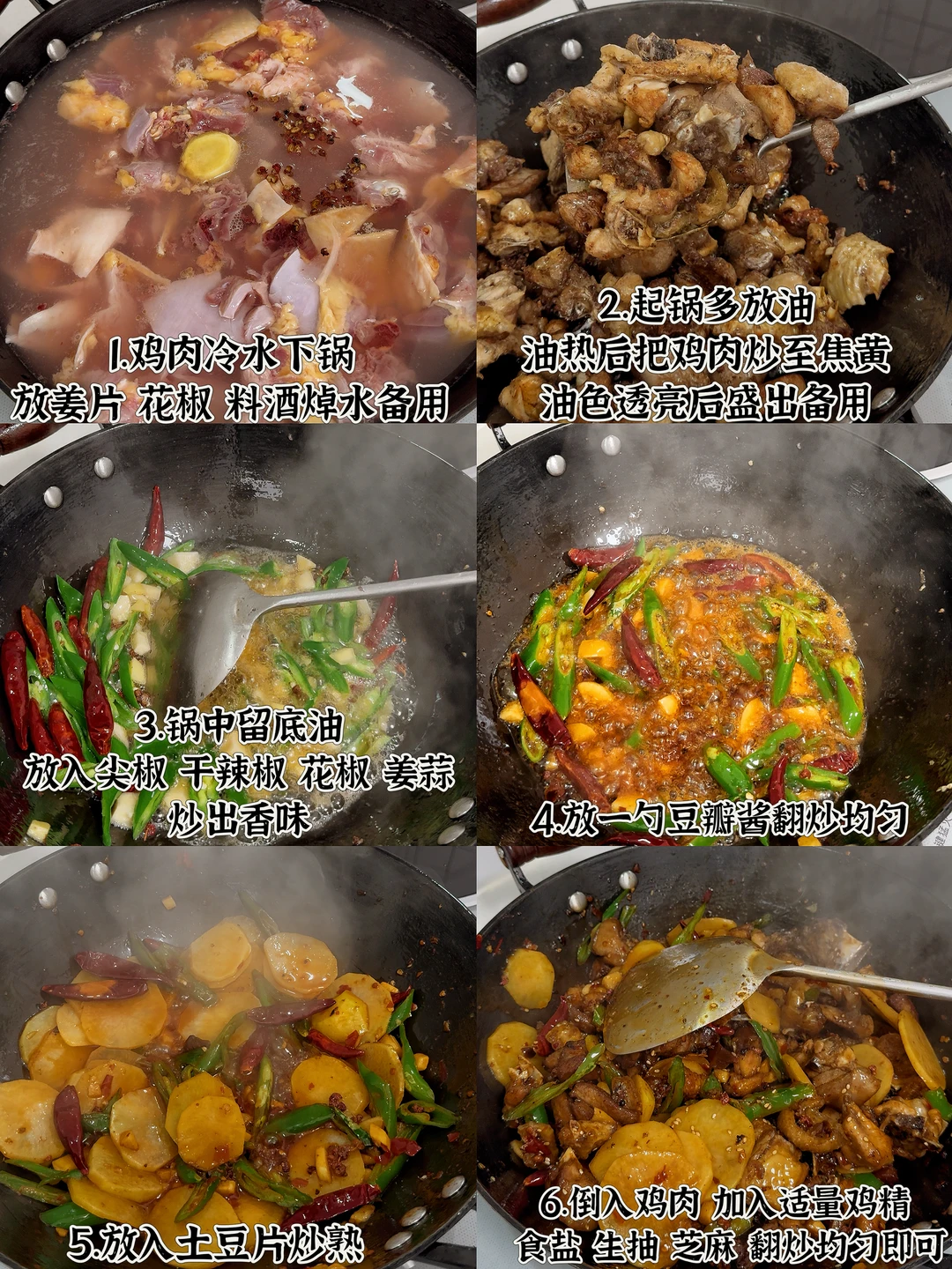 📜食材:鸡肉、土豆片、尖椒、干辣椒、花椒、姜蒜 🍳做法: 1.鸡肉冷水下锅,放姜片、花椒、料酒焯水备用 2.起锅多放油,油热后放入鸡肉炒至焦黄,盛出备用 3.锅中留底油,放入尖椒、干辣椒、花椒、姜蒜炒出香味 4.放一勺豆瓣酱翻炒均匀 5.放入土豆片炒熟 6.再次倒入鸡肉,放适量鸡精,食盐,生抽,芝麻调味即可。