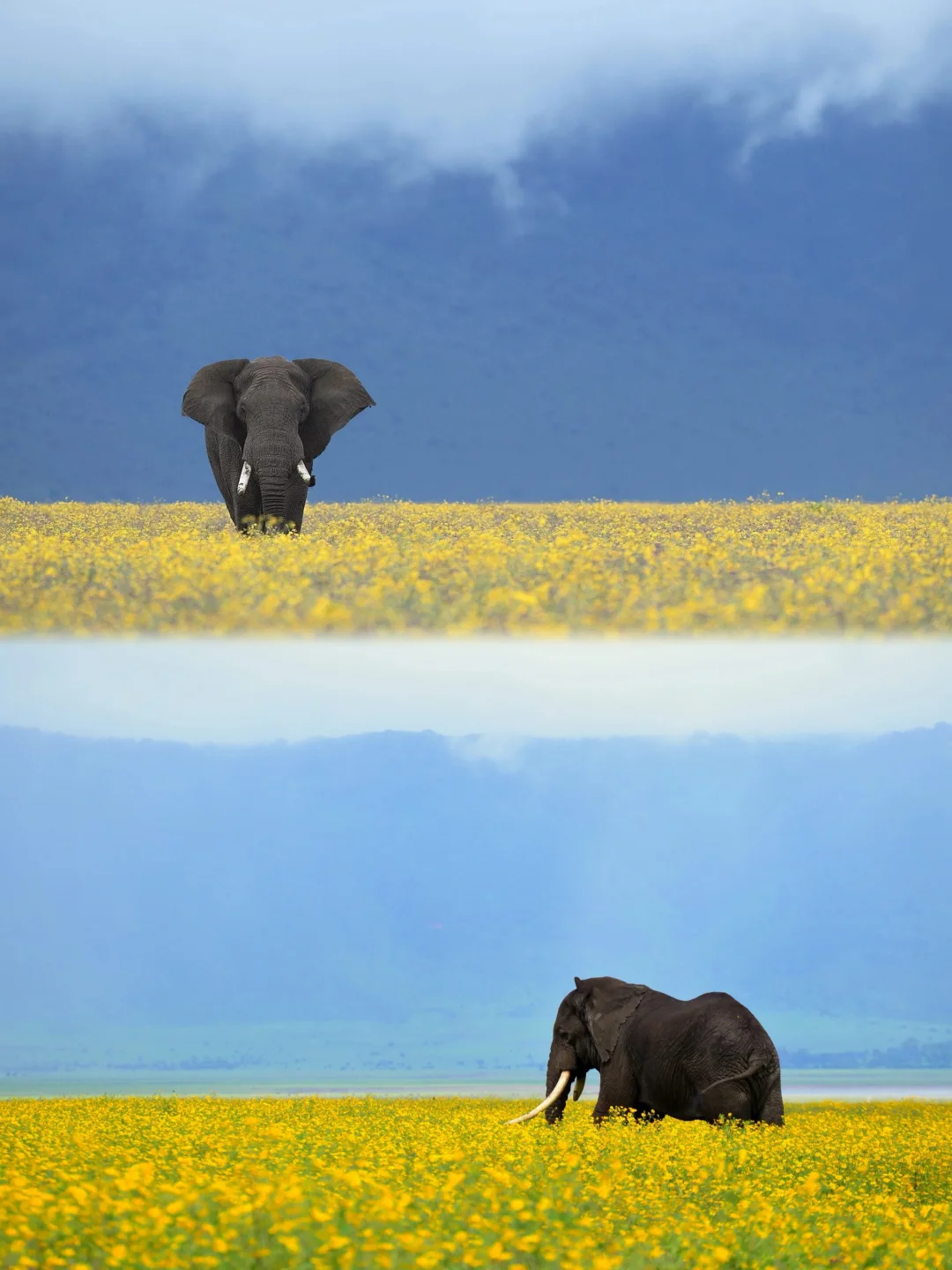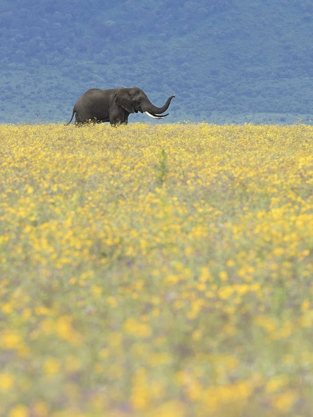 野花铺满火山口谷底,大象慢悠悠穿行花丛,狮子卧在花海小憩,斑马低头啃食青草,这才是非洲动人的模样