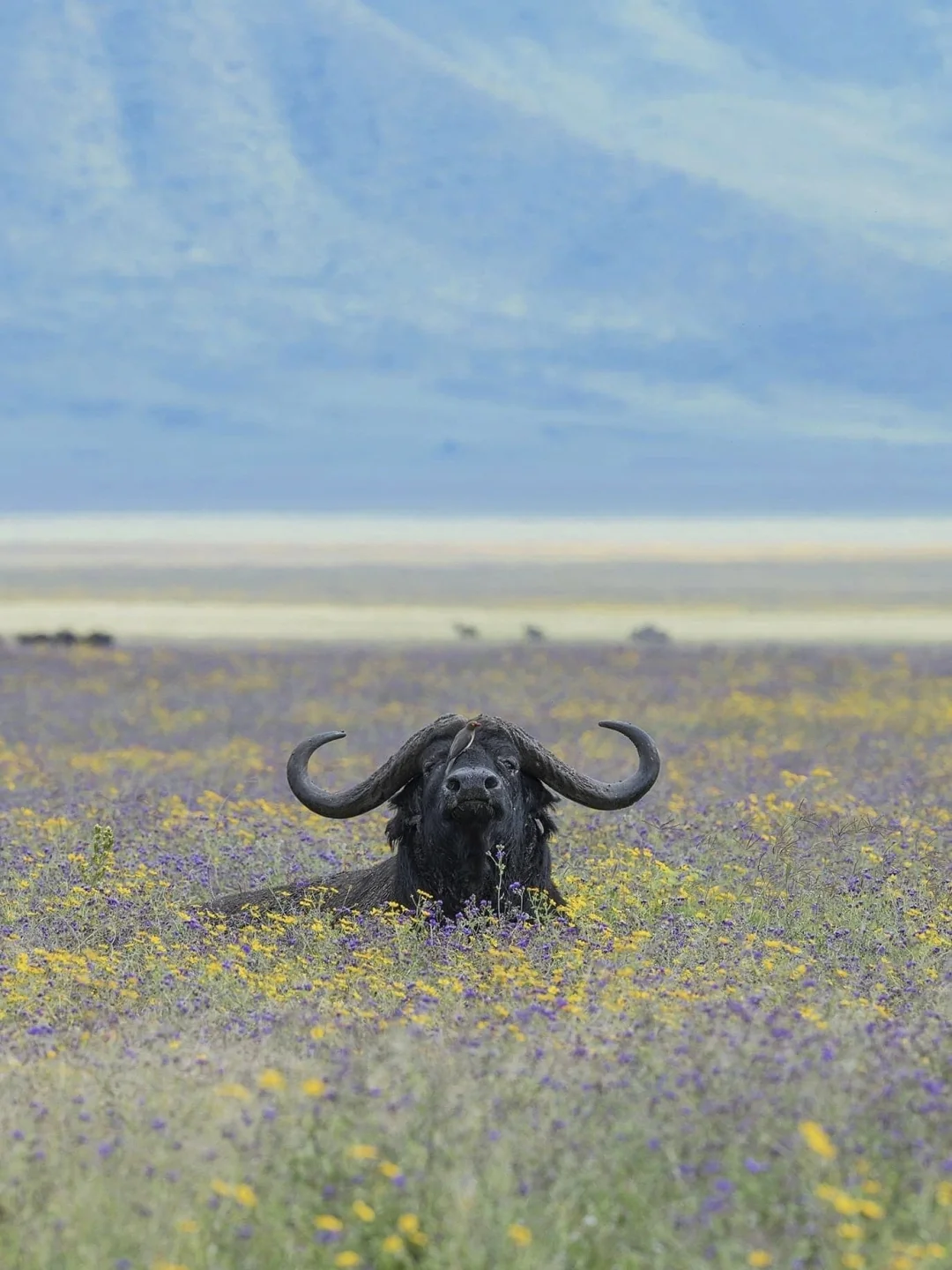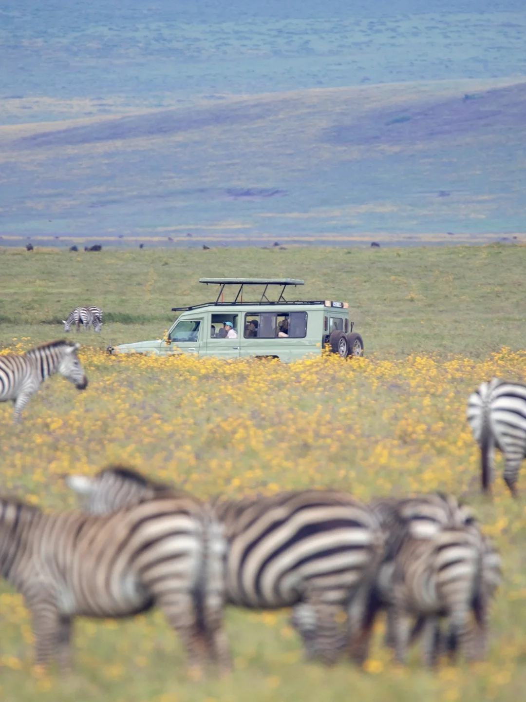 在恩戈罗恩戈罗火山口,当雨季刚刚退去,大地被重新唤醒,草原不再只是金黄,而是铺展开一片短暂却惊艳的花海