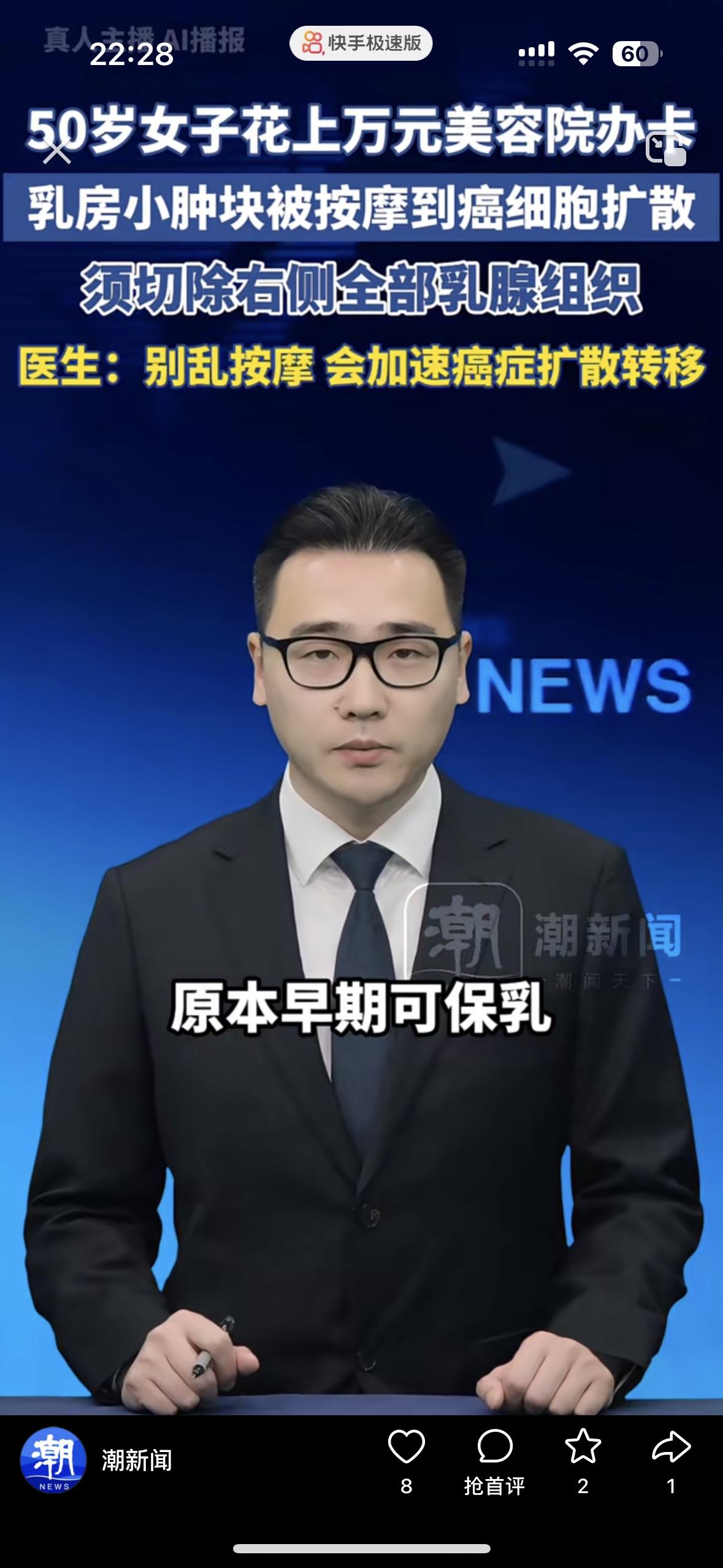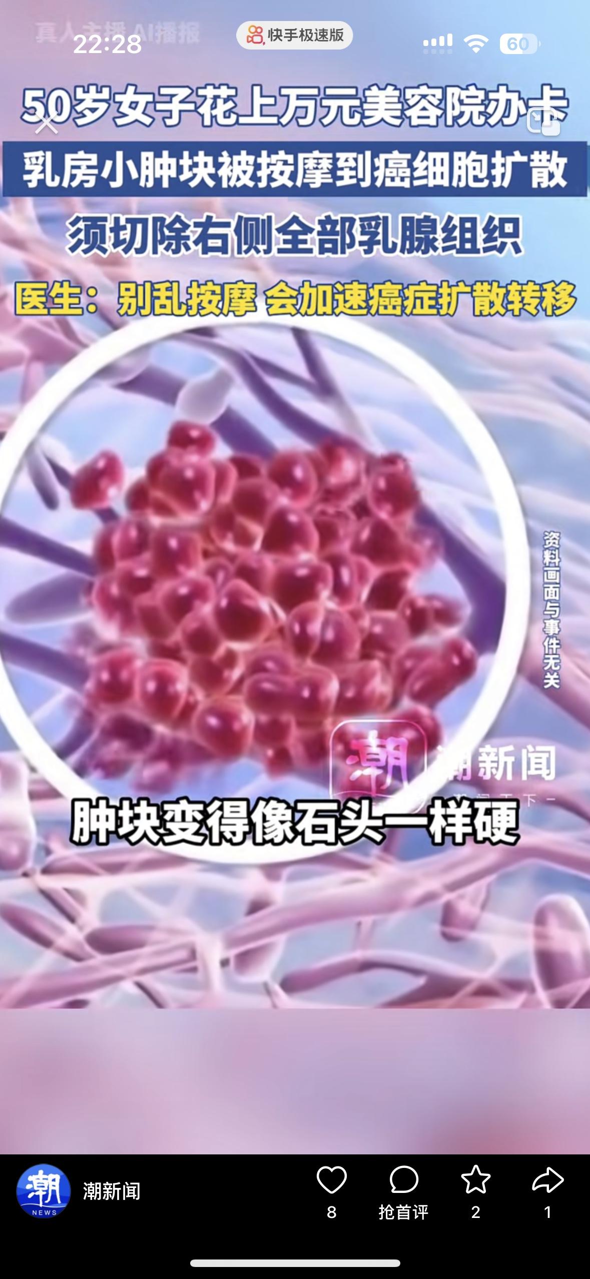 喜欢去美容院的人天塌了!一位50岁的女子发现自己乳房上有个小肿块,没有去医院检查,听信了美容院的忽悠,不用打针不用吃药,技师言之凿凿的说这是肝气郁结,经络不通,只需3个月就可以把它用精油揉开,一点毛病也不会留下。 女子听信了技师的话花了万元办卡,肿块不仅没消除,而且越来越像个石头一样硬,连腋窝都长出了硬结。等她去医院一查,是乳腺癌已经扩散了,原本早期发现可以保乳,就是因为技师乱按摩不懂瞎挤压,加速了癌细胞转移,最后不得不切除她的乳房。 乳房血管和淋巴特别丰富,千万不要让不懂装懂的人按摩,不然真是得不偿失,美容院的人为了钱什么都能说得出口,一点良心也没有!