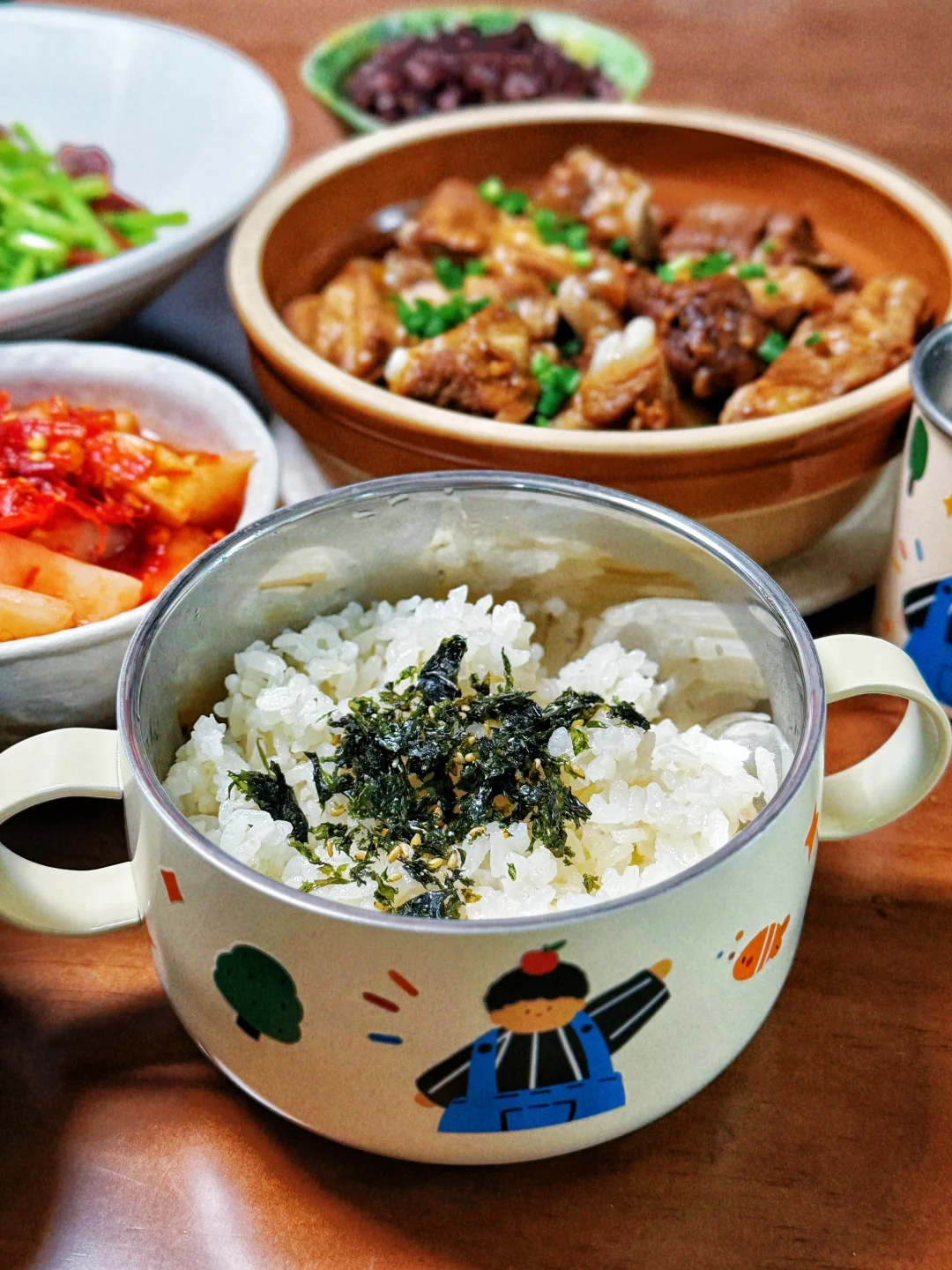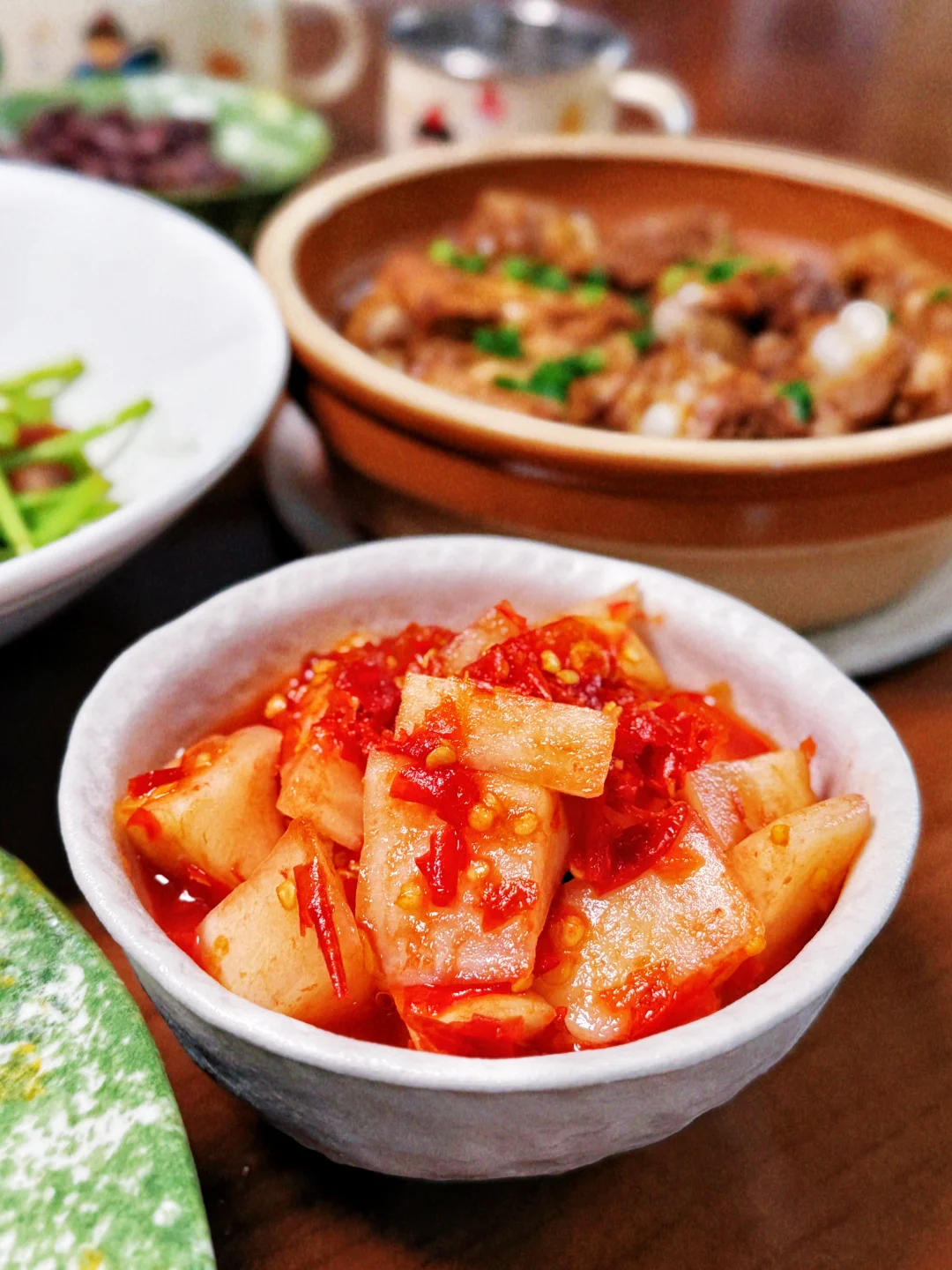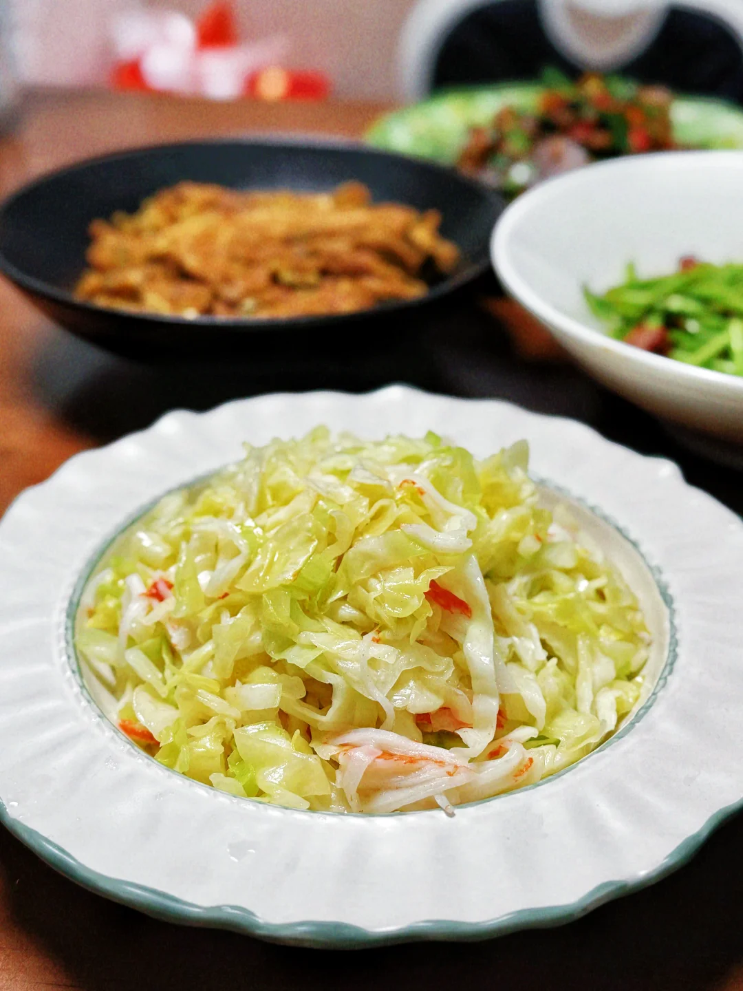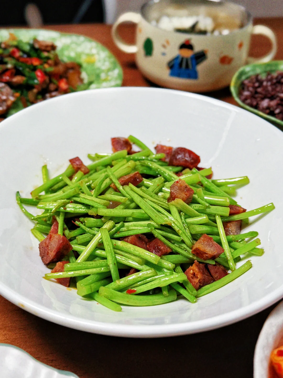 包菜丝清炒蟹味棒 香椿芽煎鸡蛋 芦蒿炒麻辣香肠 排骨蒸土豆红薯 香菜炝拌卤牛腱子 还有小莉子泡萝卜