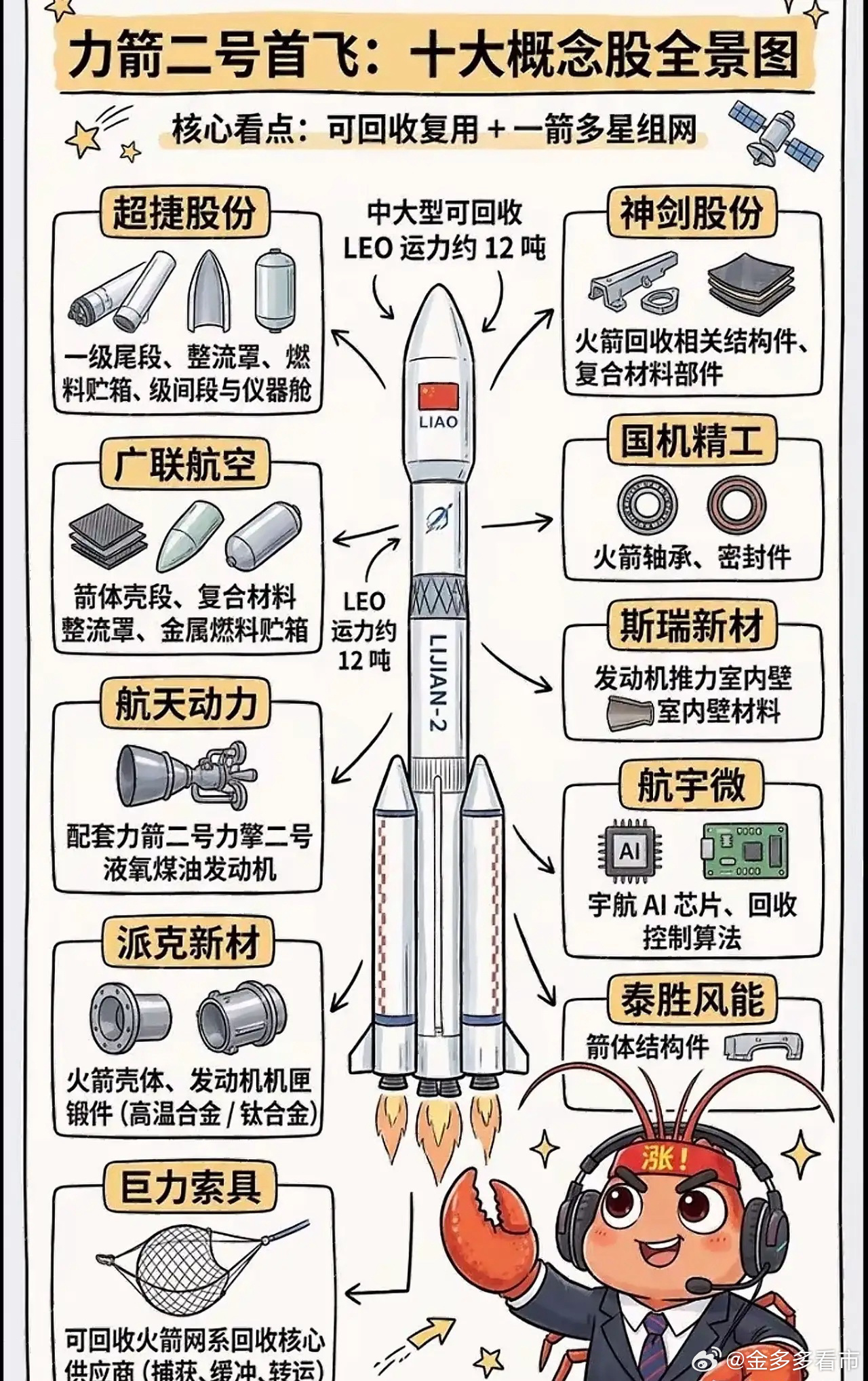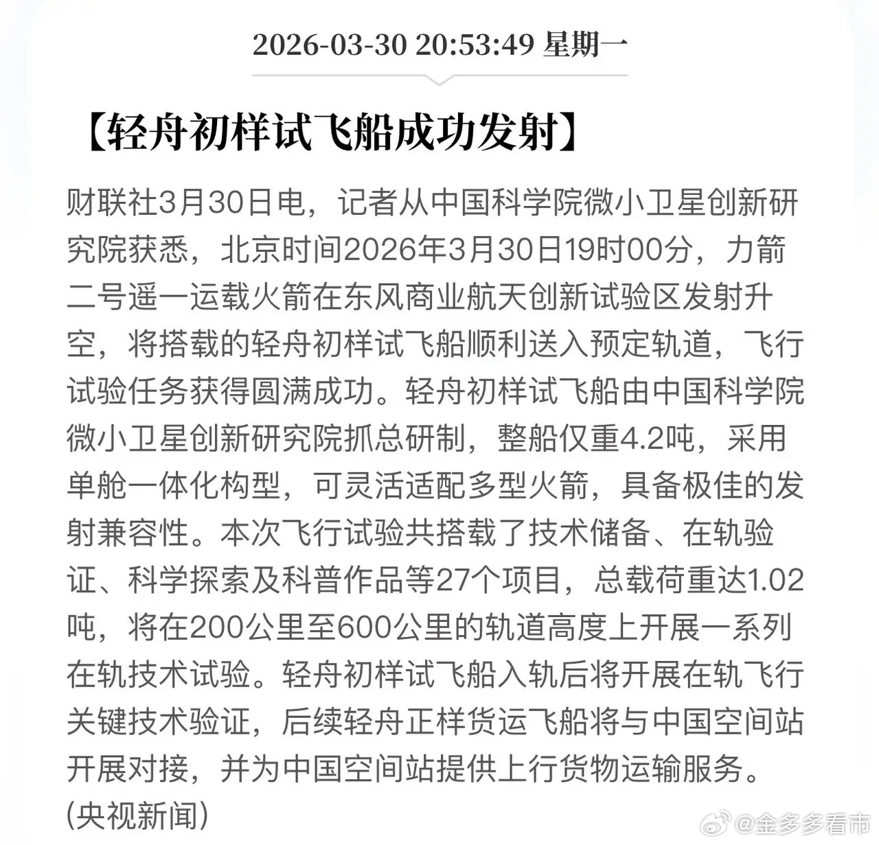中国商业航天炸场!19点整——点火,力箭二号首飞成功!3月30日,中国商业航天传来捷报!中科宇航研制的力箭二号遥一运载火箭,在东风商业航天创新试验区成功发射,将轻舟初样试飞船精准送入预定轨道,首飞任务圆满成功。这枚“大块头”火箭有何特别?力箭二号是我国首款采用通用助推器核心(CBC)构型的运载火箭,就像拼积木一样,通过模块化组合,能灵活适应不同发射任务。它总长53米,起飞重量625吨,近地轨道运载能力达12吨,是名副其实的“大运力选手”。此次首飞,力箭二号不仅验证了CBC构型、大直径光圆筒贮箱等关键技术,更展现了中国商业航天在低成本、高可靠性方面的突破。未来,它将成为低轨卫星星座组网、空间站货运补给的主力火箭,为我国航天事业提供更强有力的支撑。从力箭一号到力箭二号,中国商业航天正以“拼积木”的创新思维,不断突破技术瓶颈,向着低成本、高频次发射的目标稳步迈进。未来,它将支撑国网星座、千帆星座快速组网,服务空间站货运补给,甚至参与探月、深空探测任务。A股