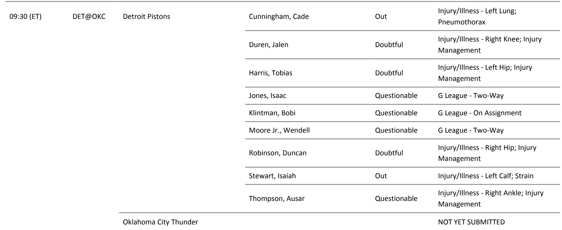 根据伤病报告,雷霆尚未提交,活塞的奥萨尔·汤普森和G联赛三人出战成疑,杜伦、邓肯·罗宾逊和托拜厄斯·哈里斯小概率出战,坎宁安和斯图尔特缺席。