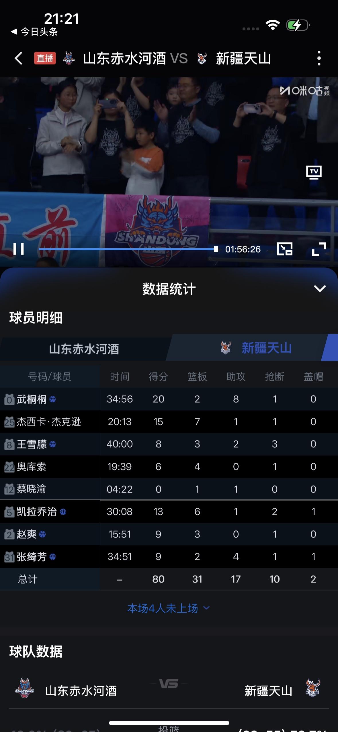 劳道!新疆天山女篮虽然输了,但是打得真不错! 在刚刚结束的新疆天山女篮客场挑战山东赤水河酒女篮的比赛中,最终新疆天山女篮以79比86输了。 纵观全场比赛,新疆天山女篮武桐桐、外援杰克逊、乔治得分上双,张琦芳、王雪朦、赵爽也有上佳表现,但是失误太多了!反观山东女篮,外援帕克表现出色,得到了31分9篮板,曹君伟也有上佳表现。 新疆天山女篮最多落后十几分,但是在第四节比赛中,曾经以67比66反超了比分,但是最后还是输了! 恭喜山东赤水河酒女篮获得胜利✌️!希望新疆天山女篮回到自己的主场再拿下山东女篮,打进四强!