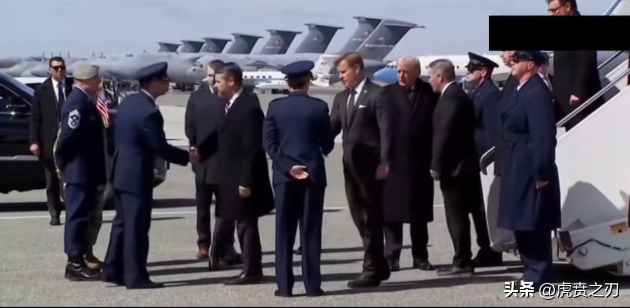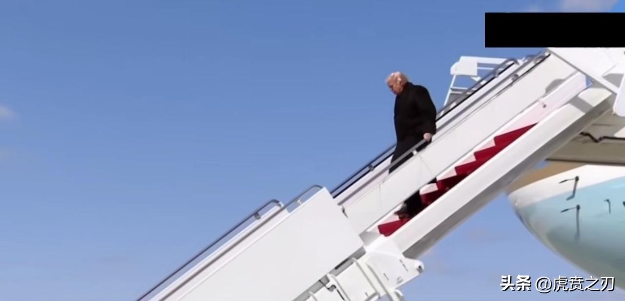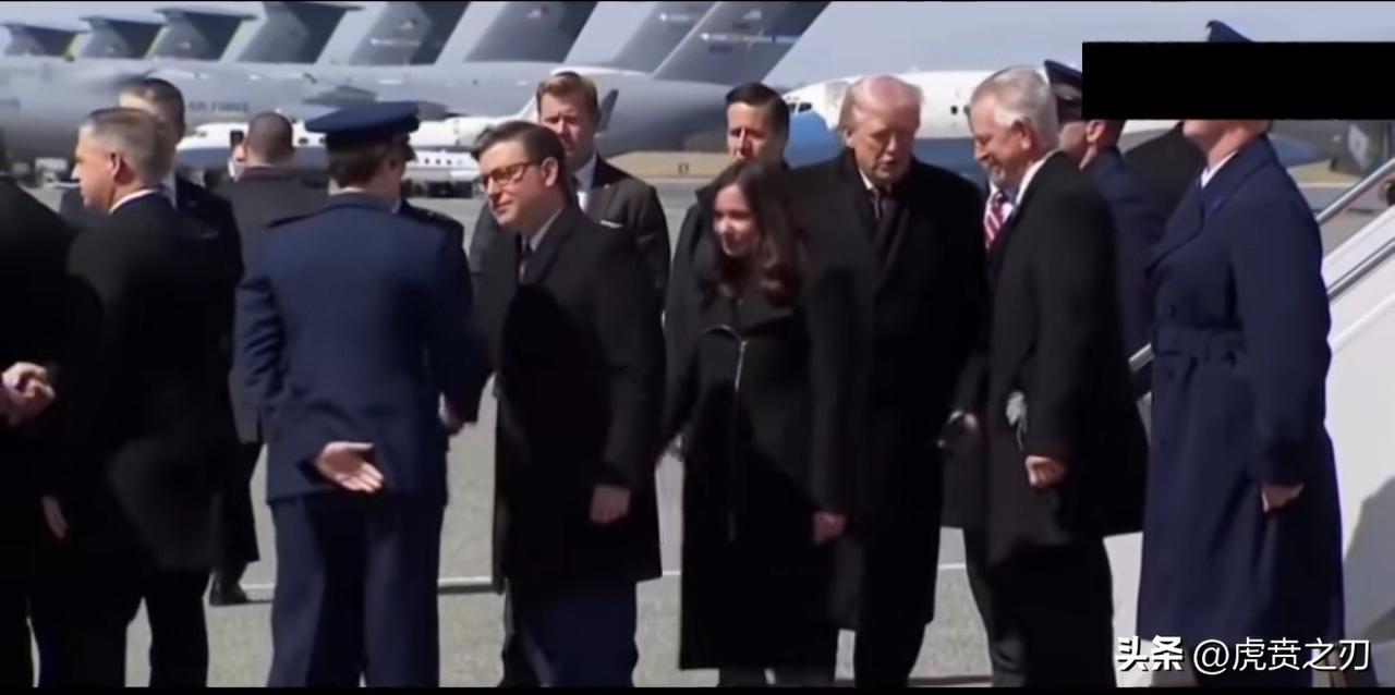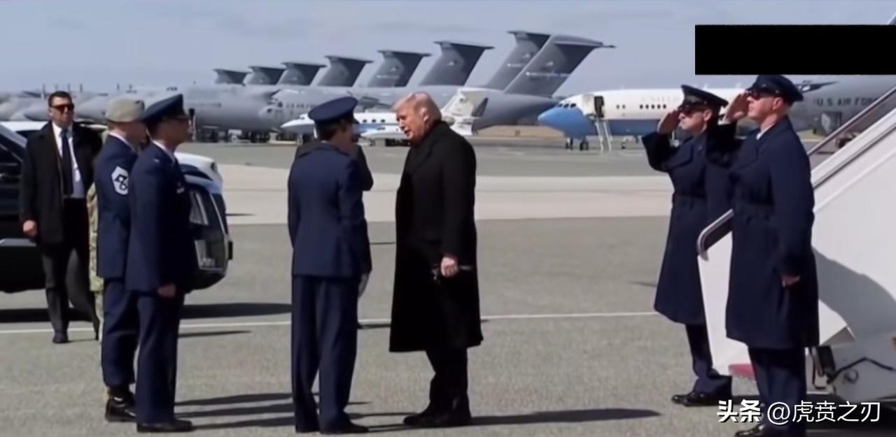 画面:特朗普缓缓从悬梯走下,毕竟八十岁了,身体怕摔着,下梯很小心翼翼,其身后跟着一大群人下来分别与接机人员握手,询问情况,看起来这机场很大,停放了许多大型军用运输机和民航机,应该是属于军民两用型机场,该视频照片右上角覆盖了黑影, 这视频是属于现场工作人员偷偷拍摄流出的吗? 但真实情况是:2026年3月伊朗袭击沙特美军加油机后,特朗普出席了阵亡士兵的遗体移交仪式,但现场画面被美媒限制传播。 由此可以判断这次可能是网友使用旧素材剪辑出这段“替身版”现场,用来讽刺信息管控失控和战争后果。