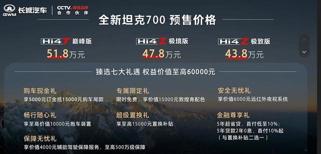 月30日,全新坦克700正式开启预售,其中全新坦克700 Hi4-T搭载3.0T插混动力系统,预售价格51.8万元;全新坦克700 Hi4-Z搭载2.0T插混动力系统,预售价格区间43.8万元-47.8万元。【来自懂车帝车友圈】