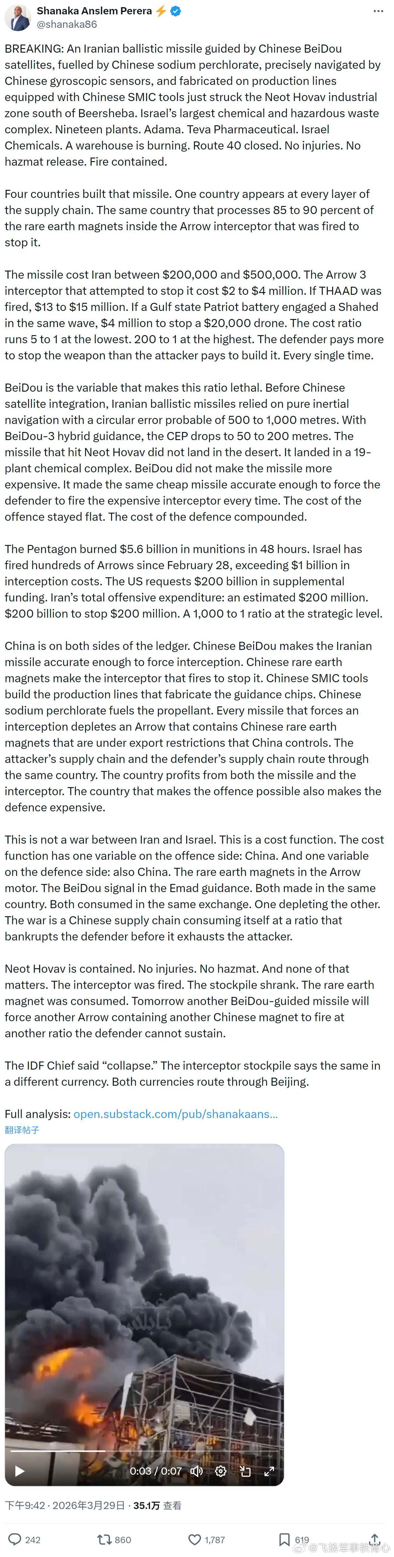 “一枚由某大卫星引导、使用某大高氯酸钠作为推进剂、依靠某大陀螺传感器进行精确导航、并在配备某大设备的生产线上制造的伊朗弹道导弹,刚刚击中了贝尔谢巴以南的内奥特霍瓦夫工业区——以色列最大的化工与危险废物综合体。”
