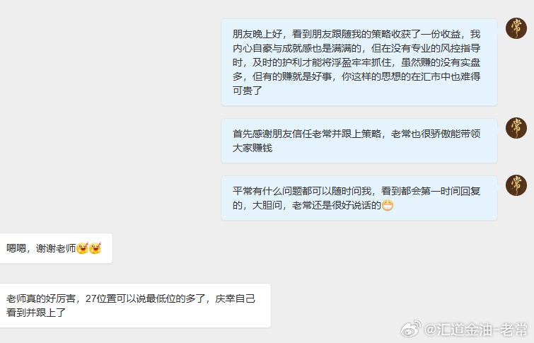 看到大家因为我的策略获益时,老常内心的成就和自豪感是无法比拟的,毕竟大家愿意信任老常,跟随我老常的策略,这点就已经在我心中弥足珍贵!