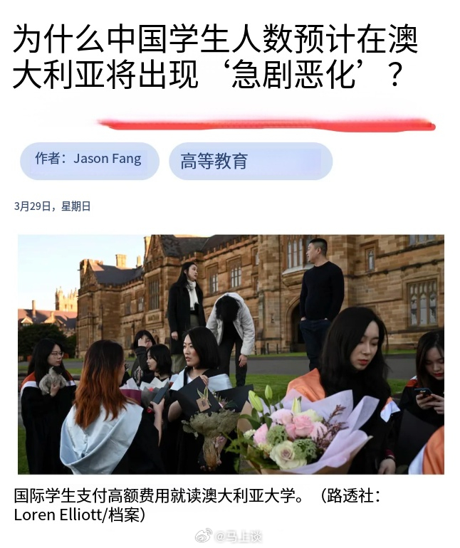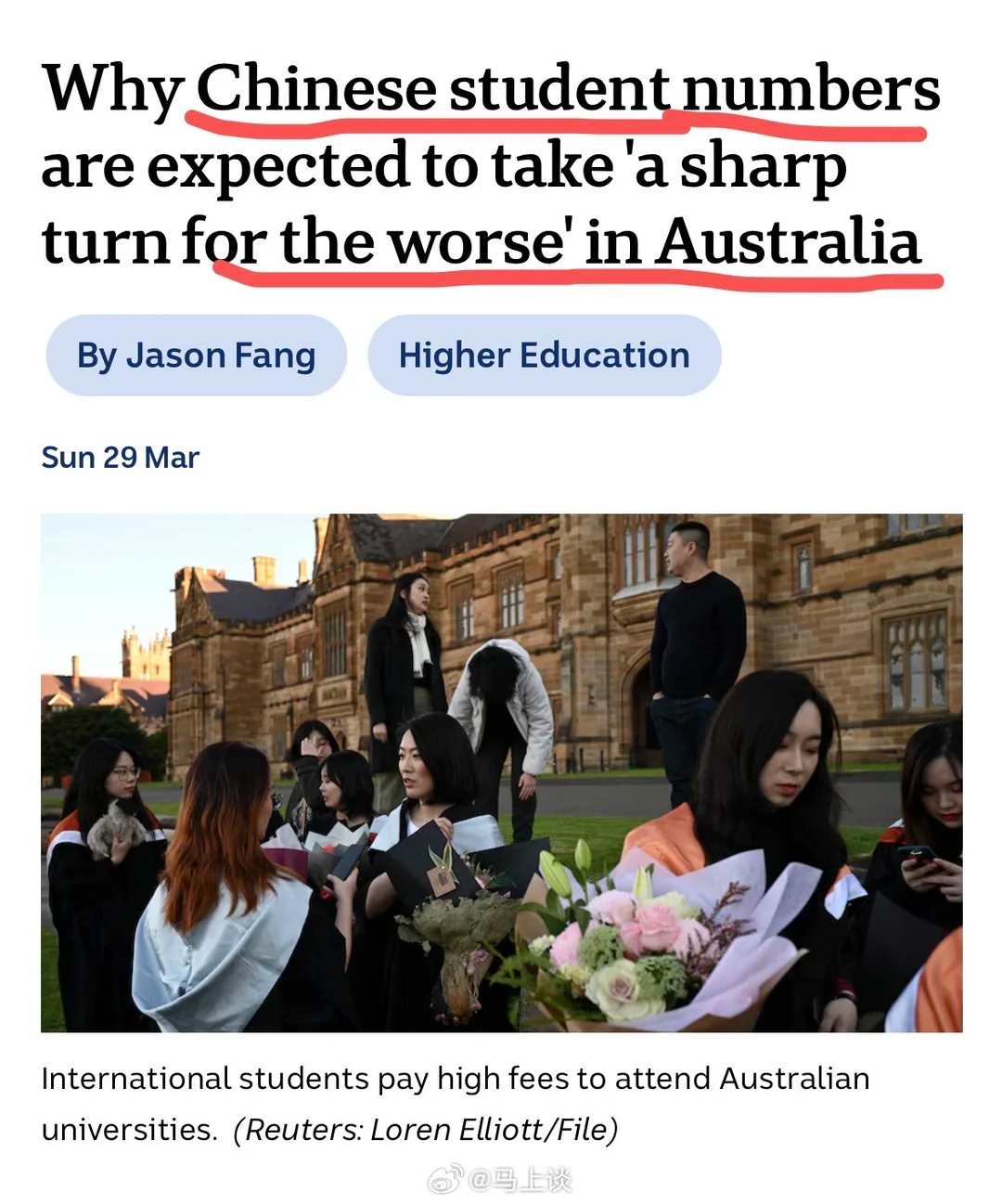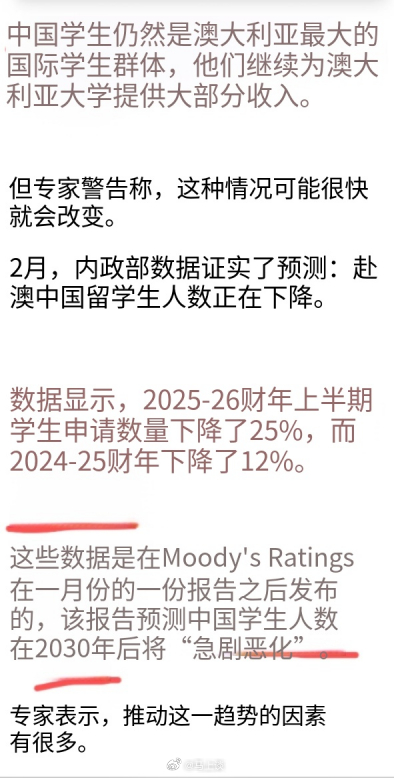 澳大利亚媒体ABC长文反思:为什么中国留学生数量急剧减少?文章称年度中国留学生的数量锐减25%,继去年12%后持续下降,预计到2030年迎来断崖式下跌,澳洲各大学将失去这个极其重要的经济来源。个人感觉主要是澳大利亚高校的水平实在是太次,除了绿卡和富家子镀金,其余我真的劝你慎重,除非家里钱多花不完请随意。