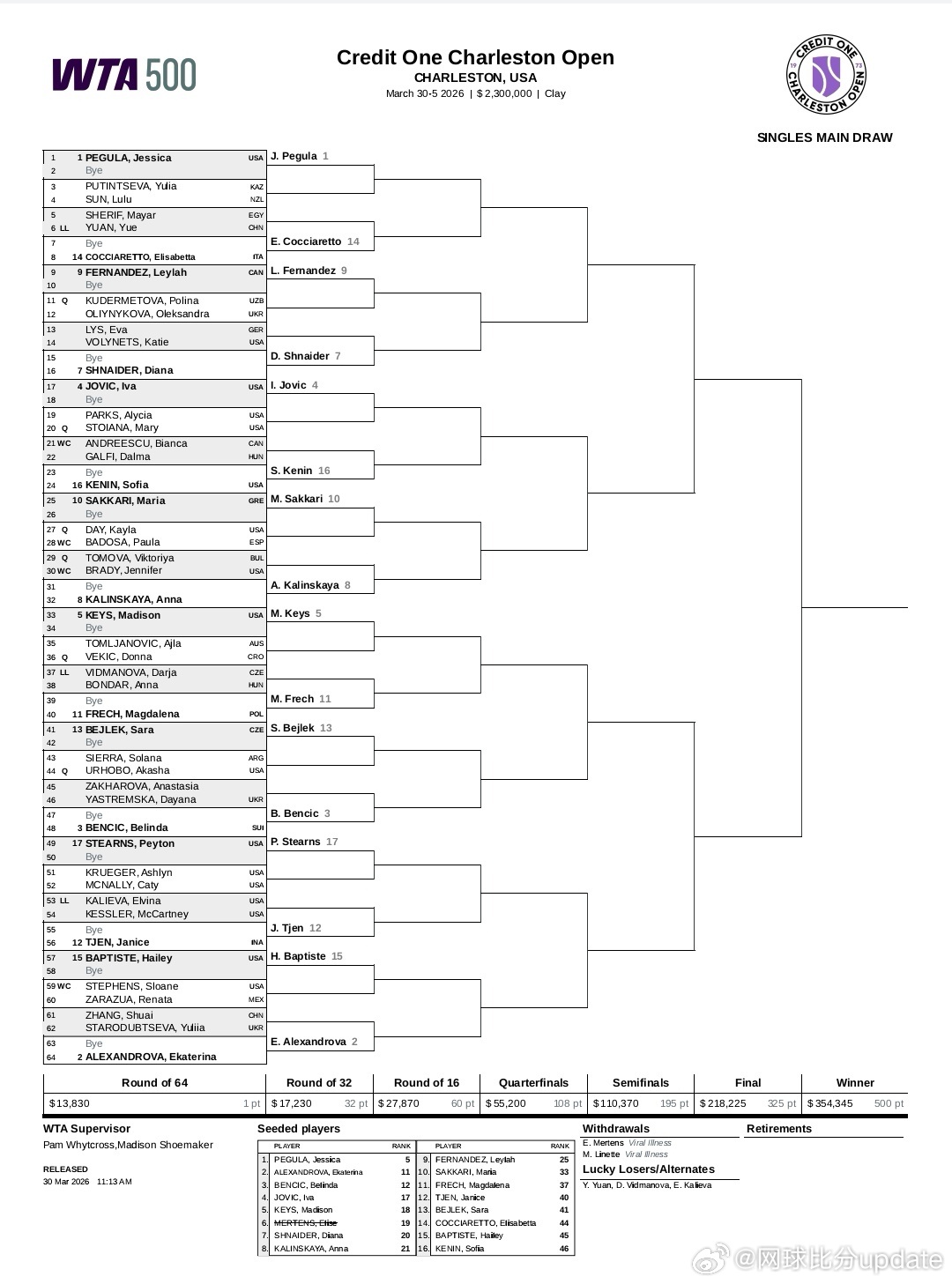 WTA500🇺🇸查尔斯顿女单签表:🇨🇳袁悦收获LL 首轮对阵 🇪🇬谢里芙
