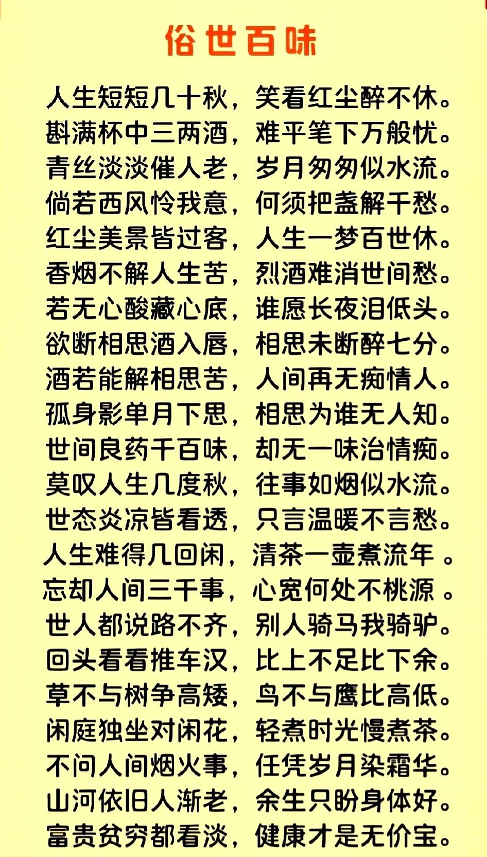 如今社会坏人多 有些实话不敢说 真假好坏难分辨 是非曲直费琢磨。 就算蹲在河边坐 未必知晓水多深 河水浑浊看不清 人心更比水难分 做好自己才叫对 莫去违法搞犯罪 辛苦劳累无所谓 踏实做人最可贵 贫穷咱也不抱怨 撸起袖子加油干 人生路上向前看 努力终会有期盼 莫给自己添压力 放开心态别在意 到头都是一场戏 人生不会倒回去 官位再大钱很多 黄泉路上跑不脱 活得明白享生活 谁想不开土里卧 人生有河也有海 莫论成败比高矮 手里有钱笑开颜 人人都把你高看 兜里没钱办事难 再帅也会遭人嫌 河水不知海水咸 土豆哪知西瓜圆 男人潇洒靠有钱 女人漂亮靠容颜 手里有钱你别飘 一山更比一山高 香烟抽完终成灰 美酒喝尽剩空杯 没有实力莫乱吹 人死烧成一堆灰 孟婆汤里都是水 奈何桥上全是鬼 忘川河畔全是泪 三生石下尽是悔 无论贫穷还是富 最后都走黄泉路 开车最怕遇大雾 思想就怕变麻木 不管干啥要有度 想要健康多散步 知足常乐就是福 才是人生真归宿