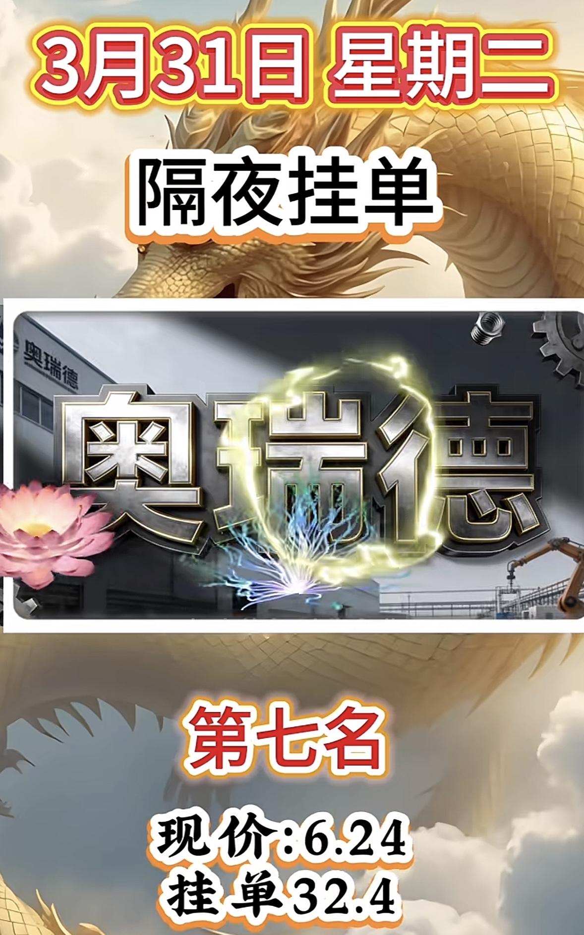3月31日周二暗盘隔夜挂单排行榜揭晓 3月31日隔夜挂单奥瑞德排第七名,这操作够刺激!3月30日奥瑞德上了龙虎榜,因价格振幅、换手率情况上榜,还是近5个交易日内第5次。当天收盘价6.24元,涨了2.63%,成交超54亿,可北向资金净卖出1.69亿。从资金流向看,主力净流出3.27亿,散户却净流入3.34亿。公司2025年三季报表现不错,主营收入、归母净利润都大幅上升。现在挂单32.4,这后续走势会咋样?真让人期待又紧张,不知道这波操作能不能带来惊喜。