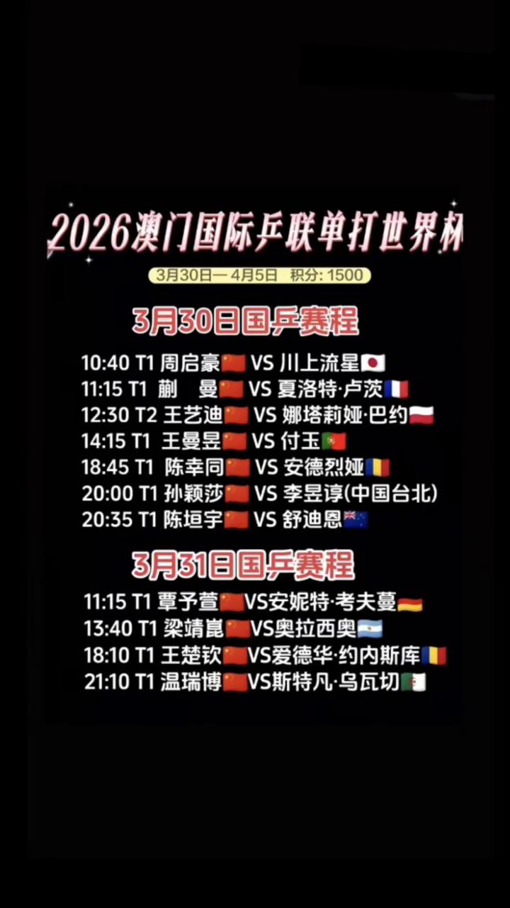 2026澳门国际乒联单打世界杯,3月30日-4月5日积分:1500。 3月30日国乒赛程: ·10:40T1周启豪VS川上流星口。 ·11:15T1蒯曼VS夏洛特·卢茨。 ·12:30T2王艺迪VS娜塔莉娅·巴约。 ·14:15T1王曼昱VS付玉。 ·18:45T1陈幸同VS安德烈娅。 ·20:00T1孙颖莎VS李昱淳(中国台北)。 ·20:35T1陈垣宇VS舒迪恩。 ·11:15T1覃予萱VS安妮特·考夫蔓。 ·13:40T1梁靖昆VS奥拉西奥。 ·18:10T1王楚钦VS爱德华·约内斯库。 ·21:10T1温瑞博VS斯特凡·乌瓦切。