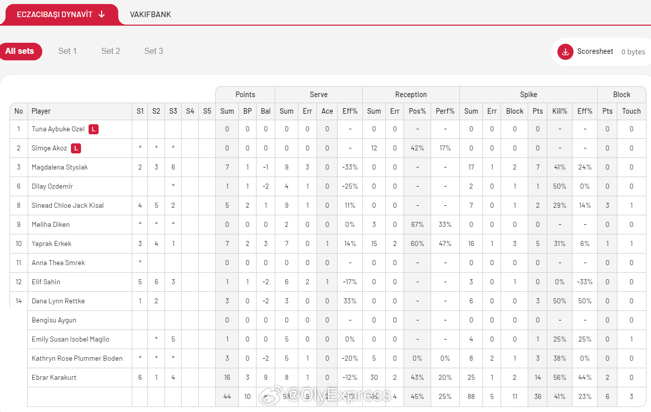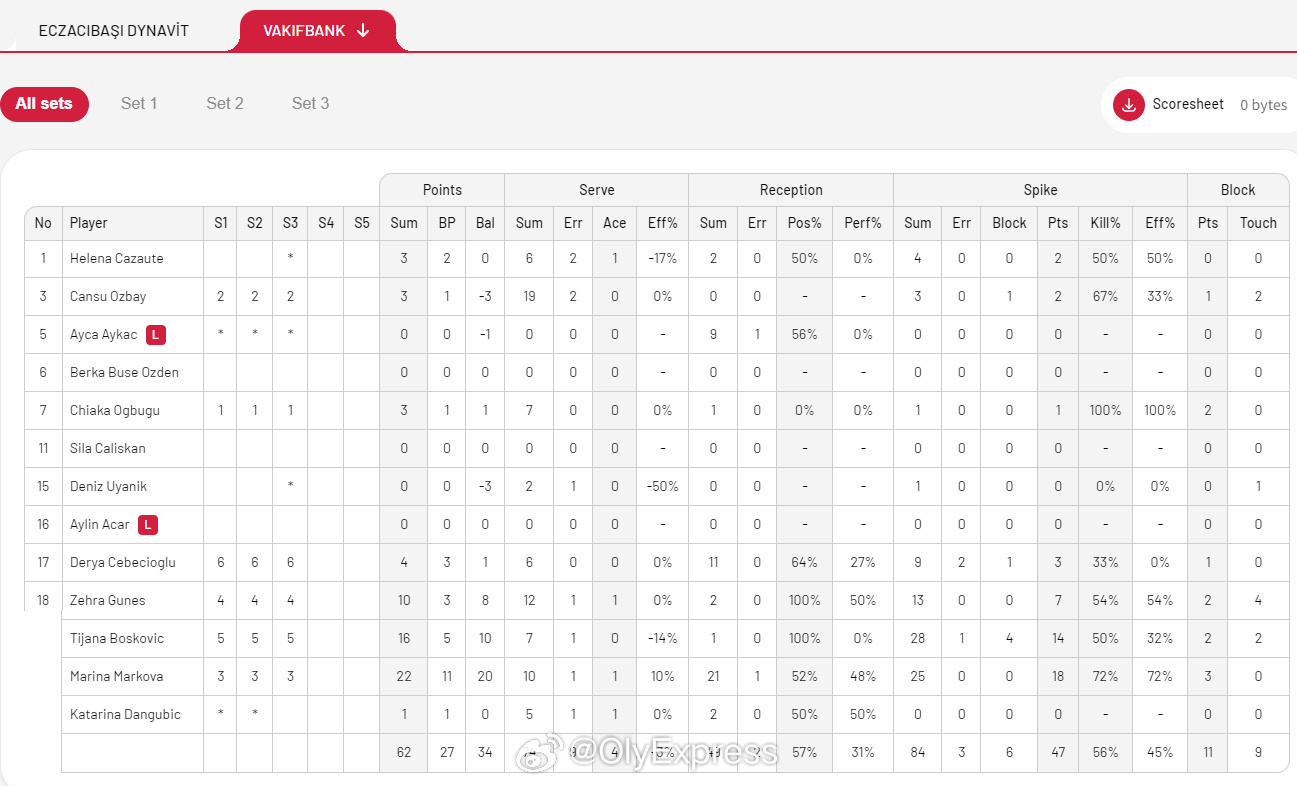 【土超女排半决赛I伊萨0-3完败瓦基弗】国际排坛战报速递 3月30日,土超女排半决赛首回合,伊萨奇巴希主场0-3(18-25/19-25/20-25)完败于瓦基弗银行。卡拉库尔特16分,马尔科娃22分、博斯科维奇16分、居内什10分。