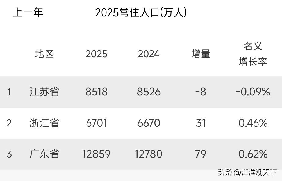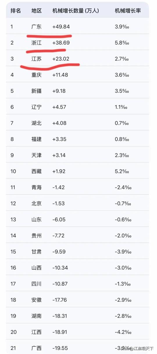 粵浙苏是人口机械增长最多的三个省,外来人口流入最多 人口统计里,有一个名词叫作机械增长,就是人口迁出和迁入,对地区整体人口数据形成了影响,这个数据区别于人口出生率和死亡率的自然增长。 在已经公布2025年人口数据的21个省市里,广东,浙江,江苏三省人口机械增长最多,可见三省有就业岗位,能够吸纳就业群体,形成了人口的机械增长。 广东人口机械增长49.84万人,浙江人口机械增长38.69万人,江苏人口机械增长23.02万人。 粵浙苏三省人口机械增长均超20万以上。人口数量分布图 人口大排行 全国人口流动 人口净流入省份 江浙GDP 各省市人口