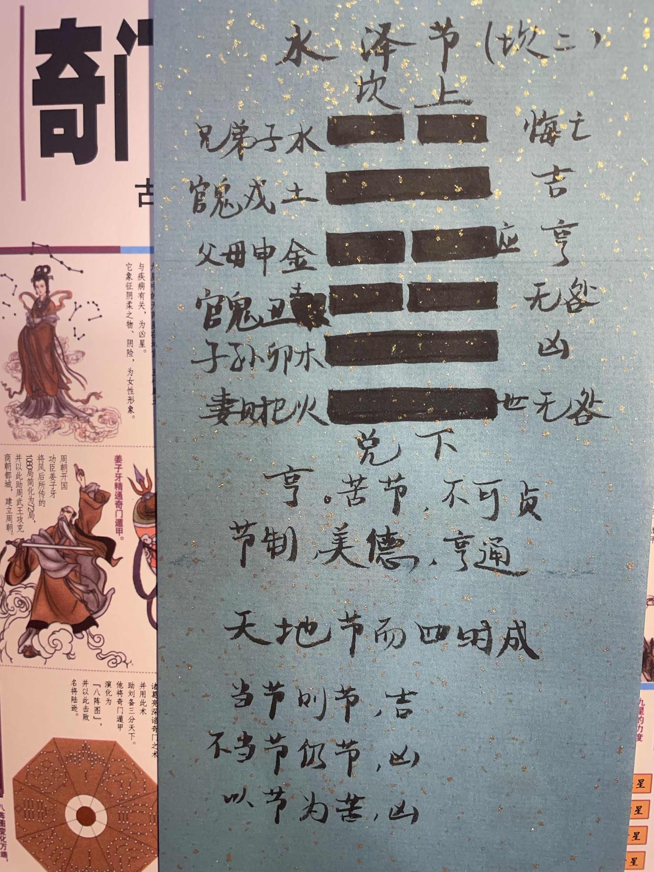 60水泽节 亨。苦节,不可贞。 初九,不出户庭,无咎。 九二,不出门庭,凶。 六三,不节若,则嗟若,无咎。 六四,安节,亨。九五,甘节,吉。往有尚。 上六,苦节,贞凶,悔亡。 水泽节卦,兑下坎上,水上泽下,水流入泽中,过度了就会溢出来,再严重就会泛滥成灾了。所以应当节制。 节制是美德,所以亨通。但是以节制为苦,坚持不下去,不利坚守正道,必定凶险。 以节为美德,以不节为恶行。应当节制的时候节制,吉利,不应当节制的时候去节制,会凶险。 天地节而四时成。当位以节,中正以通。 易学智慧 水泽节 周易 国学文化 传统文化