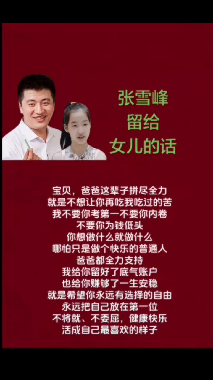 张雪峰留给女儿的话。 宝贝,爸爸这辈子拼尽全力就是不想让你再吃我吃过的苦。我不要你考第一,不要你内卷,不要你为钱低头,你想做什么就做什么,哪怕只是做个快乐的普通人,爸爸都全力支持。我给你留好了底气账户,也给你赚够了一生安稳。就是希望你永远有选择的自由,永远把自己放在第一位,不将就、不委屈,健康快乐,活成自己最喜欢的样子。