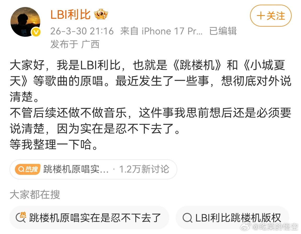 我算是看明白了,这波就是李荣浩开团,其他歌手秒跟的节奏,跳楼机原唱LBI利比也彻底不忍了,半夜发了一大堆刚环球音乐的内容出来,简单来说他的意思就是:1. 自己出钱做的EP,版权基本都在自己手里,环球非要抢母带和上架权。