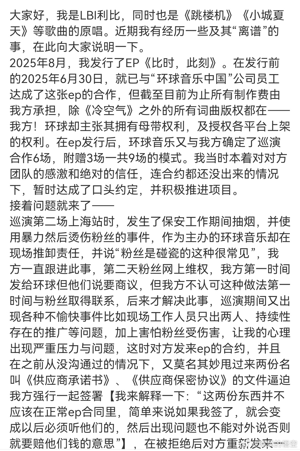 一边是信任大厂、先做事后补合同的独立音乐人,一边是流程强势、条款把控极严的唱片公司,从一开始就没把权责、版权、费用、责任划分说死。现场安保出事、主办方甩锅,属于执行层面的失职;后续强行塞霸王协议、私宣艺人身份、转嫁违约损失,不管放在哪方视角,都属于合作中的越界操作。而利比这边全程自掏成本、未获分文,却要被动承接版权争议和合作烂摊子,也确实说明了独立音乐人在面对行业大厂时,普遍存在的弱势处境。不过话说回来,这事没有一边倒的对错,但能看出来:音乐合作光靠信任没用,白纸黑字、权责对等,才是最基本的底线。