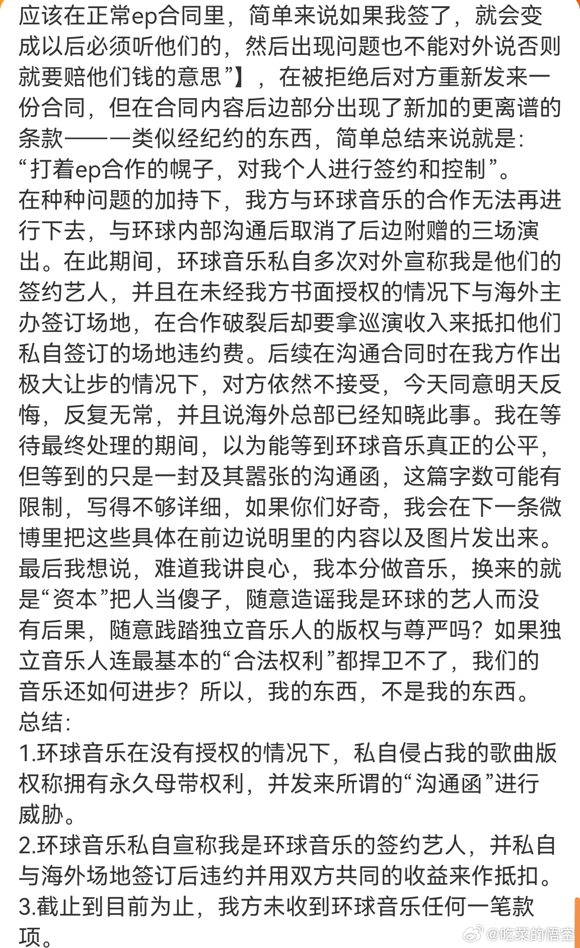 4. 合作黄了以后,环球乱讲他是签约艺人,私自签海外场地违约,还想拿巡演钱填坑。