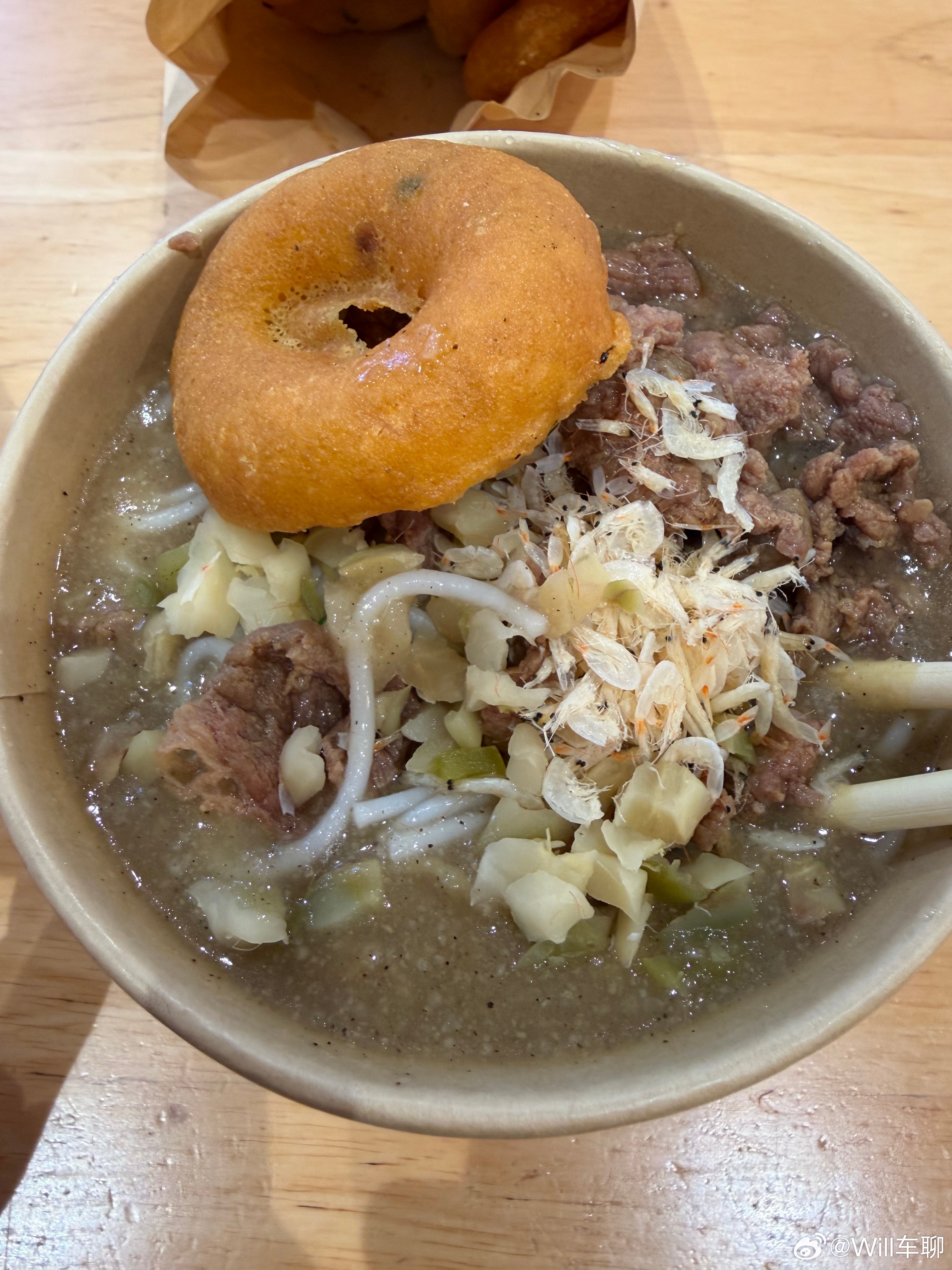 油炸小面窝刚出锅,热腾腾的,外酥里嫩,放在糊汤粉里面十几秒,外面蘸满了糊汤粉的汤汁,咬上一口,先是鲜鱼的鲜香,糊汤粉的胡椒微辣,再就是咔嚓一下小面窝的酥脆和淡淡葱香,真的几种口味层叠而来,然后再喝一口豆浆,再吃口鲜嫩的牛肉,武汉话叫做”听了头”(满足)。