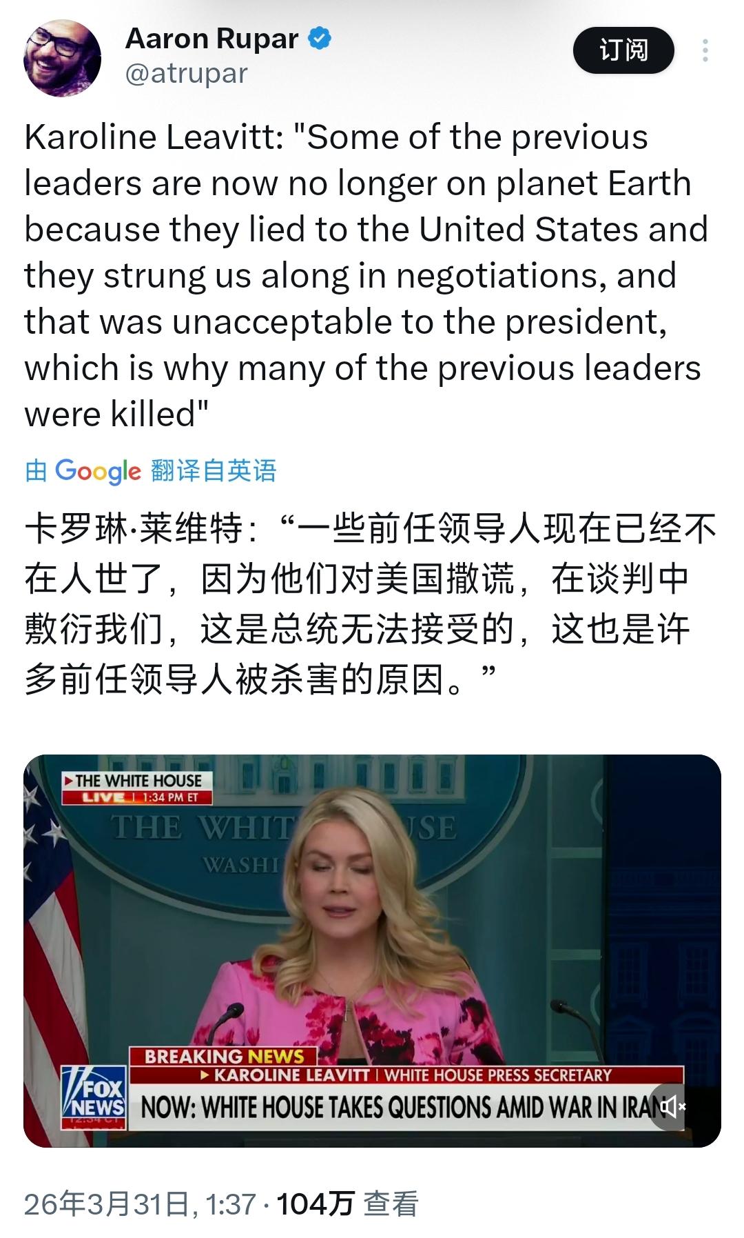 白宫新闻秘书莱维特北京时间3月31日就伊朗战争接受采访时表示:“一些前任领导人现在已经不在人世了,因为他们对美国撒谎,在谈判中敷衍我们,这是总统无法接受的,这也是许多前任领导人被杀害的原因。” 这番话听着就离谱,说白了就是霸权主义的无耻狡辩,美国分明是在非法暗杀他国领导人,却非要给自己找个冠冕堂皇的借口,把冷血的暗杀包装成“反欺诈”,把践踏他国主权的恶行,粉饰成维护自己的“谈判底线”,没有一点大国该有的底线,纯属颠倒黑白、蛮不讲理。 首先得说清楚,莱维特口中“对美国撒谎、敷衍谈判”的前任领导人,大多是伊朗的核心军政高层,而这些人的遇害,根本不是什么“撒谎敷衍”,而是因为他们不迎合美国的霸权诉求,不服从美国的无理控制,美国恼羞成怒才下的杀手。 就拿伊朗前最高领袖哈梅内伊来说,2月28日,他在美以联合发动的军事打击中遇害,多国都对他的遇害表示哀悼,谴责美以的残暴行径。 哈梅内伊作为伊朗的最高领袖,始终在维护伊朗的国家利益,从来没有对美国撒谎,更没有敷衍所谓的谈判,只是他坚持伊朗的立场,不向美国的霸权低头,不愿意让伊朗成为美国的附庸,美国就联合以色列对他痛下杀手,现在却被莱维特说成是“因为撒谎被杀”,这简直是滑天下之大稽。 还有伊朗前最高国家安全委员会秘书拉里贾尼,他是哈梅内伊的核心幕僚,也是伊朗政坛少数能和西方对话的温和派,一直致力于协调各方、推动和平谈判,3月17日,他在德黑兰郊区的住宅中遭遇空袭身亡,一同遇难的还有他的儿子和多名随从。 这样一位主张对话的温和派领导人,怎么可能在谈判中敷衍美国、对美国撒谎?可即便如此,他还是被美国列入了“暗杀清单”,最终惨遭杀害。除此之外,伊朗情报部长伊斯梅尔·哈提卜、“圣城旅”指挥官苏莱曼尼等人,也都是被美国非法暗杀的,这些人都是为了自己国家的利益奔走,却因为不服从美国的霸权,就被美国冠上“撒谎、敷衍”的罪名,惨遭毒手。 更可笑的是,美国不仅非法暗杀伊朗高层,还搞出了所谓的“正义奖赏计划”,公开悬赏1000万美元,征集15名伊朗军政高层的线索,其中就包括哈梅内伊的儿子穆杰塔巴。 在悬赏公告发出后没几天,名单中的拉里贾尼、伊斯梅尔·哈提卜就先后遇害,这哪里是什么“反欺诈”,分明是公开的“猎杀”,是赤裸裸的国家恐怖主义。 美国一边打着“谈判”的幌子,一边发动军事行动,维持着对伊朗“4到6周”的军事打击计划,还威胁伊朗要在4月6日前达成协议,否则就摧毁伊朗的发电厂、油井等设施;一边又谎称伊朗在谈判中撒谎、敷衍,把自己的暗杀行为说得理直气壮,这种自相矛盾的说法,只能暴露其霸权主义的本质。 而且莱维特口中的“谈判”,本身就是一场骗局。就在她发言的前一天,伊朗外交部发言人就明确表示,伊朗并没有和美国进行直接对话,只是通过第三方传递信息,美国提出的谈判要求,大多是极度贪婪、不切实际的,根本没有任何谈判的诚意。 美国想要的从来不是公平公正的谈判,而是伊朗无条件服从自己的控制,一旦伊朗不满足美国的无理要求,美国就会动用武力,甚至暗杀伊朗的核心领导人,试图瓦解伊朗的抵抗意志,控制中东地区的局势。 还要明确一点,美国的这些行为,完全违反了国际法和《联合国宪章》的规定。《联合国宪章》明确指出,跨境袭击他国领袖,除非有联合国安理会授权或构成自卫,否则就是侵略行为。 联合国秘书长副发言人也公开表示,反对任何构成“法外处决”的行为,认为杀害官员的做法无助于解决问题,只能加剧局势紧张。 俄罗斯、马来西亚、塞内加尔等多个国家,也都纷纷谴责美国和以色列的暗杀行径,称这种行为蓄意针对一国领导人,构成危险先例,将中东地区推向灾难边缘。 回顾历史,美国从来就没有停止过霸权行径。2020年1月,美军在巴格达国际机场发动空袭,炸死了伊朗“圣城旅”指挥官苏莱曼尼,当时美国给出的借口是苏莱曼尼威胁到了美国利益,可实际上,苏莱曼尼只是在维护伊朗的地区利益,不服从美国的霸权控制。 再比如伊拉克战争,美国以伊拉克拥有“大规模杀伤性武器”为借口,绕过联合国发动战争,导致伊拉克陷入二十余年的动荡,数十万人丧生,可所谓的“大规模杀伤性武器”,从来就没有被找到过。这些案例都证明,美国所谓的“理由”,从来都是自己为了推行霸权编造的谎言。 莱维特的这番发言,本质上就是美国霸权主义的遮羞布。他们把自己的非法暗杀包装成“反欺诈”,把践踏他国主权粉饰成“守底线”,试图掩盖自己的残暴行径,可明眼人都能看明白,美国的真实目的,就是想通过暗杀他国核心领导人,瓦解对方的抵抗意志,控制中东地区,维护自己的全球霸权。 那些被暗杀的领导人,没有一个是因为撒谎、敷衍谈判,他们只是在坚守自己国家的利益,坚守自己的立场,却被美国残忍杀害。