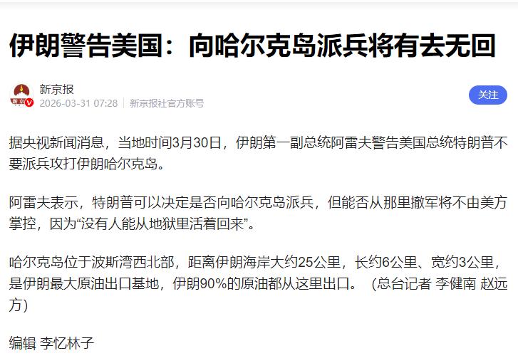 当地时间3月30日,央视新闻权威播报一则消息,瞬间刷屏全网:伊朗第一副总统阿雷夫公开发声,正面警告美国总统特朗普,禁止其派兵攻打伊朗哈尔克岛。那句决绝刺骨的狠话,至今仍在中东上空回荡:“特朗普可以决定是否向哈尔克岛派兵,但能否从那里撤军将不由美方掌控,因为没有人能从地狱里活着回来”。 一个是手握霸权的美国总统,一个是被围堵却绝不妥协的伊朗,一场围绕一座小岛的生死较量已然拉开。为何一座看似不起眼的小岛,能让双方剑拔弩张、互放狠话?阿雷夫的底气,到底来自哪里?这背后,藏着关乎全球格局的深层博弈,每一个细节都令人心惊。 一、哈尔克岛:不止是小岛,更是伊朗的“命根子” 很多人不解,哈尔克岛究竟有何魔力,能让伊朗拼死守护?这座位于波斯湾西北部的小岛,距伊朗海岸约25公里,长仅6公里、宽3公里,看似渺小,却是伊朗的经济命脉。作为伊朗最大原油出口基地,这里承载着伊朗90%的原油出口量,堪称波斯湾上的“能源阀门”。 伊朗大部分海岸线水深不足,无法停靠大型油轮,哈尔克岛得天独厚的地理位置,成为其原油出口的唯一核心通道,专家直言:“伊朗经济没有它就会崩溃”。对特朗普而言,拿下这座岛,就等于掐住伊朗的喉咙;对伊朗而言,守护这座岛,就是守护国家的生存底线。 二、狠话背后:伊朗的底气,从来不是空谈 阿雷夫的狠话,绝非空洞叫嚣,而是伊朗殊死抵抗的底气彰显。据悉,伊朗近几周已在哈尔克岛全面加强防御,增派革命卫队精锐、部署肩射地对空导弹,甚至在海岸线布设地雷,严防美军两栖登陆。 这座小岛早已被伊朗打造成“铜墙铁壁”,历史上曾在两伊战争中遭受上千枚炸弹轰炸,却从未完全中断原油出口,这份韧性,早已刻进伊朗的骨子里。反观特朗普,一边放狠话威胁,一边悄悄向中东增派兵力,看似强势,实则暴露了其底气不足——国内反战情绪高涨、党派对立严重,一场持久战,美国未必耗得起。 结语:小岛博弈,藏着霸权与正义的终极较量 哈尔克岛的较量,从来不是简单的军事对抗,而是霸权主义与国家主权的正面交锋。特朗普妄图通过掌控这座小岛,垄断中东能源、操控全球油价,殊不知,伊朗的硬刚,早已给霸权主义敲响警钟。 一句“没人能从地狱里活着回来”,是伊朗的决心,更是所有被霸权压迫国家的心声。如今,美军兵力持续向中东集结,哈尔克岛局势愈发紧张!来评论区聊聊你的预判:特朗普敢贸然出兵吗?✅ 敢 / ❌ 不敢?这场小岛之争会不会引发更大冲突?留个观点,关注我,第一时间跟进中东局势最新走向,抽3条优质留言一起深度探讨!
