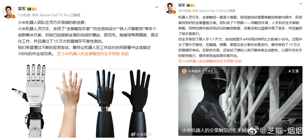 雷总近期连续更新小米人形机器人进展,这次全是实打实的工程细节。现在研发重心彻底放在最难的灵巧手上,也是落地工厂干活的关键瓶颈。