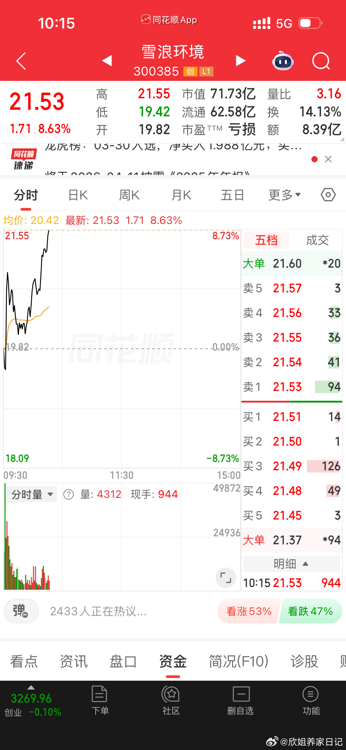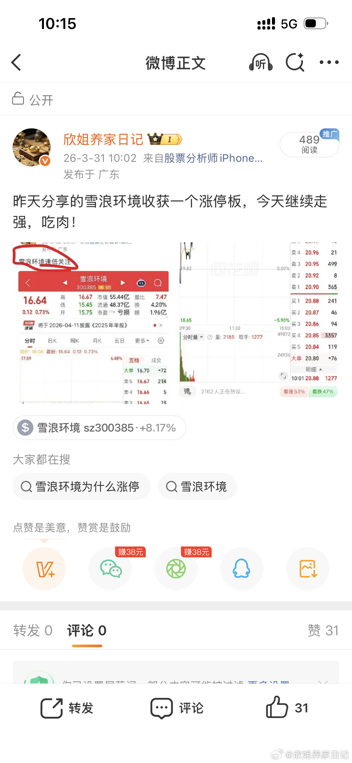 昨天分享的雪浪环境收获一个涨停板,今天继续走强,吃肉!