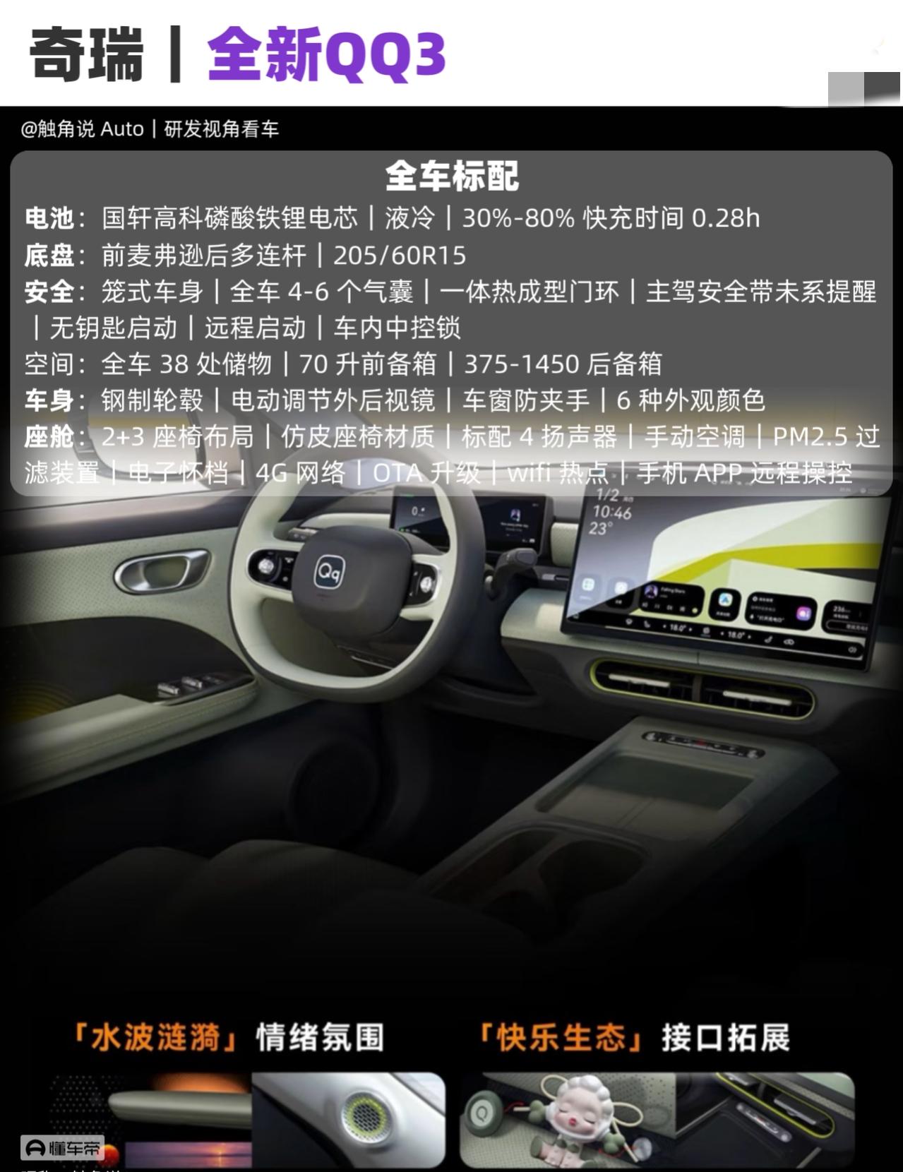 国民神车回归!全新奇瑞QQ3 EV上市,5.89万起太香了 3月30日全新奇瑞QQ3 EV正式上市,4款配置一口价5.89-7.89万,纯电代步直接卷到顶! 💰 价格&配置速览 - 310热爱版5.89万|310km续航+58kW电机+540°全景+ESP - 310分享版6.79万|15.6英寸2.5K屏+8155芯片+主驾电动/通风/加热 - 420热爱版6.89万|420km续航+90kW电机+快充16.5分钟 - 420分享版7.89万|可选猎鹰500智驾+高速NOA+记忆泊车 ✅ 必看亮点 - 轴距2700mm,5门5座,宝妈带娃、闺蜜出行都够用 - 全系犀牛液冷电池,IP68防水,三电终身质保 - 8155芯片+AI灵犀智舱,Carmind智能体,可玩性拉满 - 桃天粉/云粉米等6款配色,女生代步颜值拉满 🎁 购车权益 下订1000元享至高2.6万福利:整车+三电终身质保、终身基础流量、免费OTA、电动前备箱等 📌 选购建议 ✅ 必选:310分享版(6.79万),智能+舒适一步到位 ✅ 次选:420热爱版(6.89万),长续航更省心 ❌ 慎选:310热爱版,配置偏基础,女生用稍显寒酸 奇瑞QQ3EV 5-8万纯电小车 女生代步车 新车上市