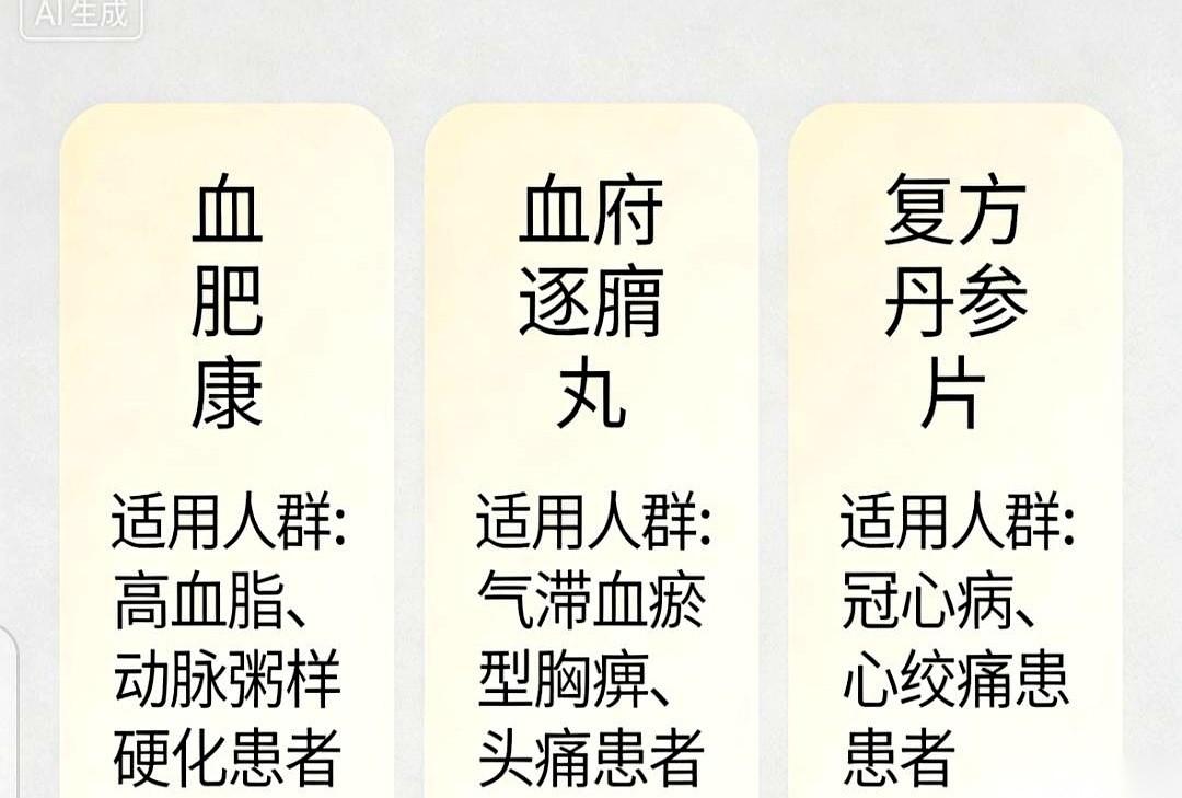 药店里,我指着那排红盒子问,“高血脂,吃哪个?” 柜台大姐头都没抬,顺手抽出一盒血脂康,“都拿这个,降得快。” 我差点就付钱了。 幸好多问了一句:“但我最近老感觉身上有刺痛,手脚也发麻,吃这个对症吗?” 大姐这才从柜台里抬起眼,扫了我一下,默默把血脂康推了回去。 她转身,从另一个架子上拿来一盒血府逐瘀丸,往台上一放,声音不大但很清楚:“那你得吃这个。你这是堵住了,光盯着指标降没用,得先活血通瘀。” 我手停在半空。 她又顺手指了指旁边一排复方丹参片,“那个更不一样,那是给那些动不动就胸口闷、心脏不舒服的人备的,主要任务是护心,降脂只是顺带手。” 我后背瞬间有点发凉。 好家伙,这三兄弟,看着像,脾气完全是拧着来的。 血脂康,就是个硬核指标杀手,对着总胆固醇、甘油三酯一顿猛攻。 血府逐瘀丸,压根不管指标,它就是个管道疏通工,专门对付你身体里的“瘀堵”。 复方丹参片,更是个“心脏保安”,主业是让你胸口顺气,别老觉得憋得慌。 从那以后我算是明白了,吃药这事儿,最怕的就是听别人说“大家都这样”。 身体是你自己的,堵了就得通,高了就得降,虚了就得补。用错一颗,那真不是白花钱的事儿,是拿自己的身体在瞎试。