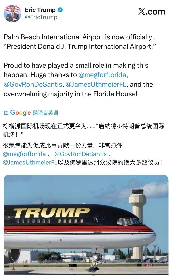 特朗普二儿子太高调了!太张扬了! 从特朗普二儿子的最新消息看,他在自己的社交平台直接向外宣布一个重要事项。 特朗普二儿子发文说:就是佛罗里达棕榈滩国际机场正式更名为唐纳德特朗普国际机场了。另外特朗普二儿子还称,很荣幸能为促成此事贡献一份力量。非常感谢。并艾特一下几个重要的人物,还有就是以及佛罗里达州众议院的绝大多数议员! 很多网友看到特朗普二儿子的做法后,也是纷纷调侃说:好家伙,下一步直接把美国也改成特朗普国吧!川皇实至名归,川皇威武,美国改名可以提上议程了。从网友的留言中我们可以看出现在不仅特朗普很飘,就连他的儿子们也很飘了。 记得在3月29日的时候,美国很多城市都涌现出很多人出来反对特朗普,反对美伊冲突,不知道特朗普的儿子看到没有,也不知道特朗普看过没有,估计就算是他们看到了也应该被自己所谓的贡献冲昏了头脑。 从特朗普二儿子给这个机场改称父亲的名字我们可以看出,现在的特朗普家族所有人真是太自以为是了。特朗普才上台还不到两年,整体吹自己的创造了很多贡献,也吹嘘说:美打击伊朗已经彻底赢了,就等着伊朗给他们签署协议。要是真的像特朗普说的那样,估计以后特朗普还有他们的孩子们更加骄傲自满了。 另外特朗普比儿子还要厉害,他还声称要把霍尔木兹海峡改名叫特朗普海峡。真是有其父必有其子啊!不知道在特朗普当总统期间,还能做出更加离谱的事情。当然也有网友称特朗普当总统就是为了家族赚钱。特朗普自己赚取名声,孩子们赚取财富,真是名利双收。