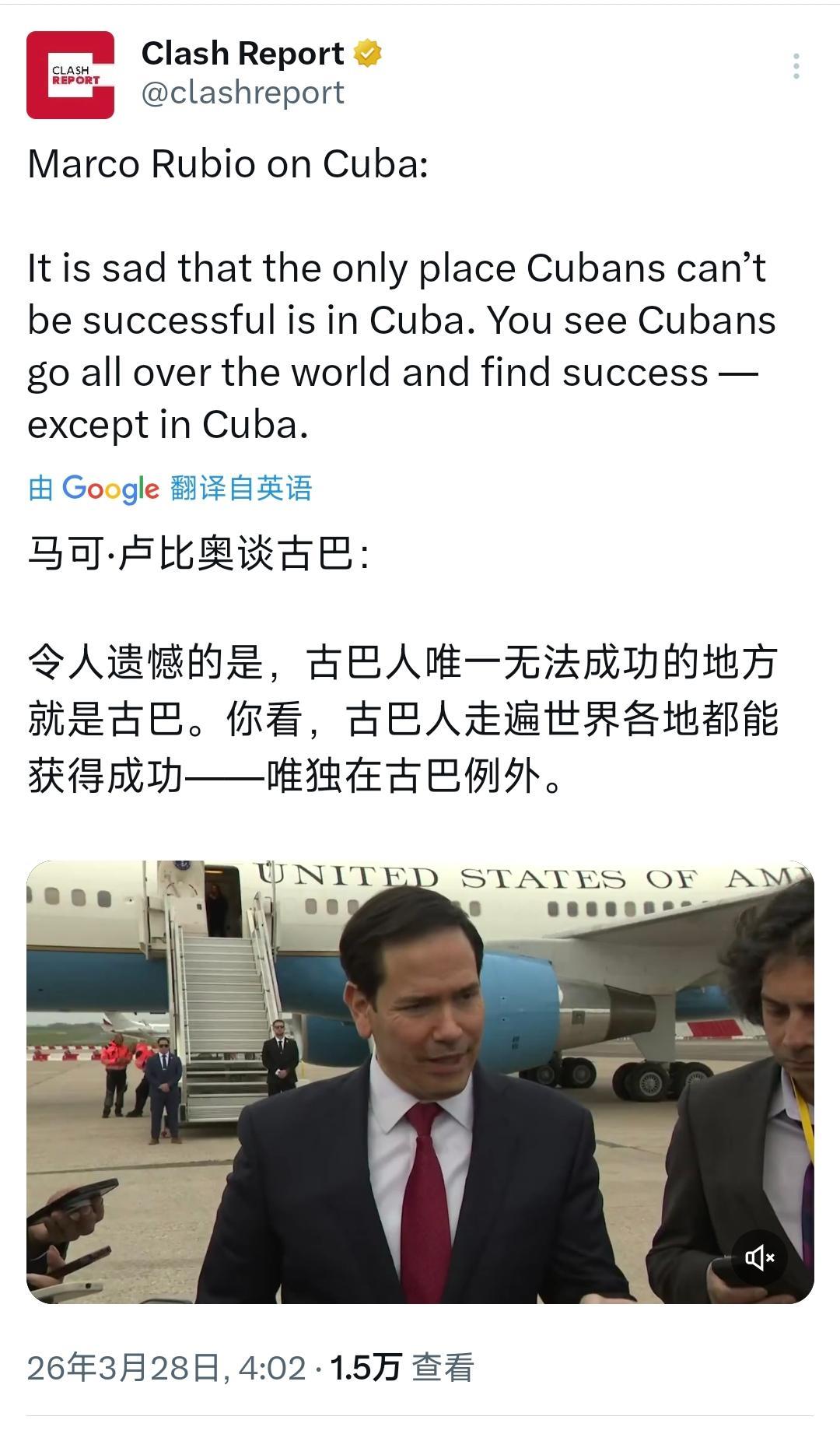 美国国务卿鲁比奥今天(北京时间3月28日)谈到古巴时表示:“令人遗憾的是,古巴人唯一无法成功的地方就是古巴。你看,古巴人走遍世界各地都能获得成功唯独在古巴例外。” 鲁比奥身为古巴裔本应对古巴的现实处境有更清晰的认知,却刻意回避关键问题将古巴的发展难题简单归咎于自身,这种说法很难让人认同。 美国迈阿密的古巴社群经过多年打拼形成了颇具规模的商业群体,不少人在当地实现了事业发展。 还有在文艺体育领域的古巴裔从业者,比如知名音乐人格洛丽亚・埃斯特凡,排球名将莱昂纳多・莱瓦・马丁内斯都在海外展现了自身能力。 但不能因此就否定古巴本土的发展潜力更不能忽略一个核心问题。 古巴在本土的发展面临诸多阻碍核心原因是美国长达六十多年的全方位制裁,硬生生掐断了古巴正常的经济发展路径。 从1962年开始美国就对古巴实施全面的经济、金融和贸易限制,这一措施持续至今。 1996年美国出台相关法案不仅限制本国企业与古巴开展经贸往来,还对和古巴有经济合作的其他国家企业进行施压试图将古巴孤立在全球经济体系之外。 长期的限制给古巴带来了巨大的经济损失,仅2024年至2025年这一年时间古巴的经济损失就达到75.56亿美元,同比增长近五成。 在古巴普通民众的生活深受外部限制的影响,哈瓦那一位汽车修理从业者曾转行做出租车司机,因为海外配件难以进入古巴,维修车辆的成本居高不下普通家庭根本难以承担。 还有当地民众身患重病需要长期用药却因为药品进口受阻,只能辗转托人从海外寻找常常耽误治疗时机。 2026年古巴还出现了较为严重的能源供应紧张问题,短期内两次出现全国大范围停电情况。 背后的重要原因就是美国对古巴的能源进口进行阻挠,导致古巴石油供应出现较大缺口。 联合国相关机构多次指出美国对古巴的长期限制,严重影响了古巴民众的基本权利也违背了国际社会公认的准则。 联合国大会每年都会就终止美国对古巴限制的议题进行投票,2025年有165个国家投下赞成票,但美国始终没有改变相关政策依旧用单边措施影响古巴的发展。 鲁比奥成长于美国的古巴移民家庭长期持有对古巴的强硬态度,在过往的政治生涯中也多次推动对古巴的限制措施,以此迎合部分群体的诉求为自身的政治发展谋求支持。 他自身在美国拥有稳定的发展环境却对古巴民众的现实困境视而不见,反而将问题归咎于古巴自身,这种做法并不客观也缺乏对故土同胞的基本共情。 其实古巴本身具备不错的发展基础,国内拥有丰富的矿产资源旅游资源也十分优质,海滩风光和历史文化景观吸引着世界各地的游客。 即便在外部重重限制下古巴的医疗和教育水平在拉美地区依旧处于前列,古巴医护人员还经常前往其他国家参与人道主义援助工作。 古巴人在陌生的环境中都能打拼出一番事业,若是在自己的国家拥有公平稳定的外部条件必然能创造更多发展成果。 鲁比奥作为美国国务卿,其言论代表着美国的部分政治立场但他忽略了古巴的真实处境,也忘记了自身的族裔背景。 看待一个国家的发展不能脱离其所处的国际环境,更不能刻意掩盖关键的外部因素,只有尊重事实才能对事物做出公正的评判,这也是国际社会应当遵循的基本准则。