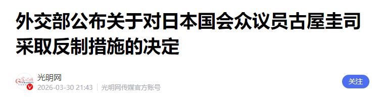 日本多次喊话中国,希望能够缓和中日关系,甚至,日本驻巴西大使公开喊话中国,愿意解决与中国在台湾问题上的外交紧张关系,同时致力于稳定两国的双边关系。 但没想到,中国不仅没有搭理,而且直接宣布对日本国会众议员古屋圭司采取反制措施。 日本国会众议员古屋圭司长期在涉台问题上肆意挑衅,多次无视中方的严正警告,执意窜访中国台湾地区,主动与 “台独” 分裂势力勾连,还不断发表违背一个中国原则的错误言论,粗暴干涉中国内政,严重损害中国的主权和领土完整,也公然违反了中日四个政治文件的核心精神。 中方早已就古屋圭司的恶劣行径向日方提出严正交涉,明确要求日方约束本国政客的行为,恪守对中方的政治承诺,但是日方始终没有正视中方的核心关切,既没有制止古屋圭司的挑衅行为,也没有对其进行约束管教,任由其在涉台问题上持续滋事,不断触碰中国的红线。 日本的示好从始至终都缺乏最基本的诚意,只是停留在口头层面的表面文章。一边对外宣称要解决台湾问题上的外交紧张、稳定双边关系,一边却纵容本国政客窜台勾连 “台独”,在台海问题上不断插手中国内政,发表损害中国核心利益的言论,这种言行不一的做法,根本不是真正想要缓和关系,而是想靠空口白话敷衍中方,既想维持对华关系的表面平稳,又想在涉台问题上继续搞小动作。 中国在处理国家间关系时,始终坚持原则,对话与缓和必须建立在相互尊重、恪守共识的基础上,绝不可能接受一边喊着缓和,一边损害中国核心利益的虚伪做法,所以对于日本这种没有实质诚意的喊话,中方自然不会轻易回应,更不会顺着日本的思路妥协。 2026 年 3 月 30 日,中国外交部依据《中华人民共和国反外国制裁法》,正式公布对古屋圭司的反制措施,具体包括冻结其在中国境内的动产、不动产和其他各类财产,禁止中国境内的组织、个人与其进行任何交易、合作等活动,同时对其不予签发签证、不准入境中国内地及香港、澳门地区。 这一反制举措,是中方维护国家主权、安全、发展利益的正当合法行为,也是对日本政客涉台挑衅的明确惩戒,清晰传递出中国在台湾问题上的坚定立场,台湾问题是中国核心利益中的核心,是不可逾越的红线,任何国家、任何政客都不能在这个问题上挑衅中国,否则必然要承担相应的后果。 日本原本以为口头示好就能让中方让步,既能在涉台问题上保留挑衅空间,又能让中日关系回归平稳,这种两头讨好的想法本身就不切实际。 中方的反制措施直接戳破了日本示好的假象,让日本清楚认识到,中国不会被口头的缓和表态迷惑,只会以实际行动捍卫自身核心利益。 如今日本的处境格外尴尬,主动示好没有得到中方的积极回应,涉台挑衅的政客被中方依法反制,日本国内也对政府这种言行不一的对华政策产生质疑,原本想要缓和关系的目标完全落空,反而让中日之间的矛盾更加突出,双边关系的紧张程度进一步升级。 中日关系持续紧张,根源完全在日本一方,并非中国不愿缓和关系,而是日本始终没有拿出真正的诚意,没有恪守一个中国原则,没有停止在涉台问题上的错误言行。 中国一直秉持善意,愿意推动中日关系健康稳定发展,但这需要日方拿出实际行动,反思自身错误,停止干涉中国内政,停止纵容政客勾连 “台独”,真正尊重中国的核心利益和重大关切。 日本现在这种空喊缓和、实则挑衅的做法,只会让两国关系越来越僵,尴尬的局面也只会持续下去,想要真正改善中日关系,日本必须先纠正自身的错误,用实际行动兑现承诺,而不是靠空洞的表态敷衍了事。