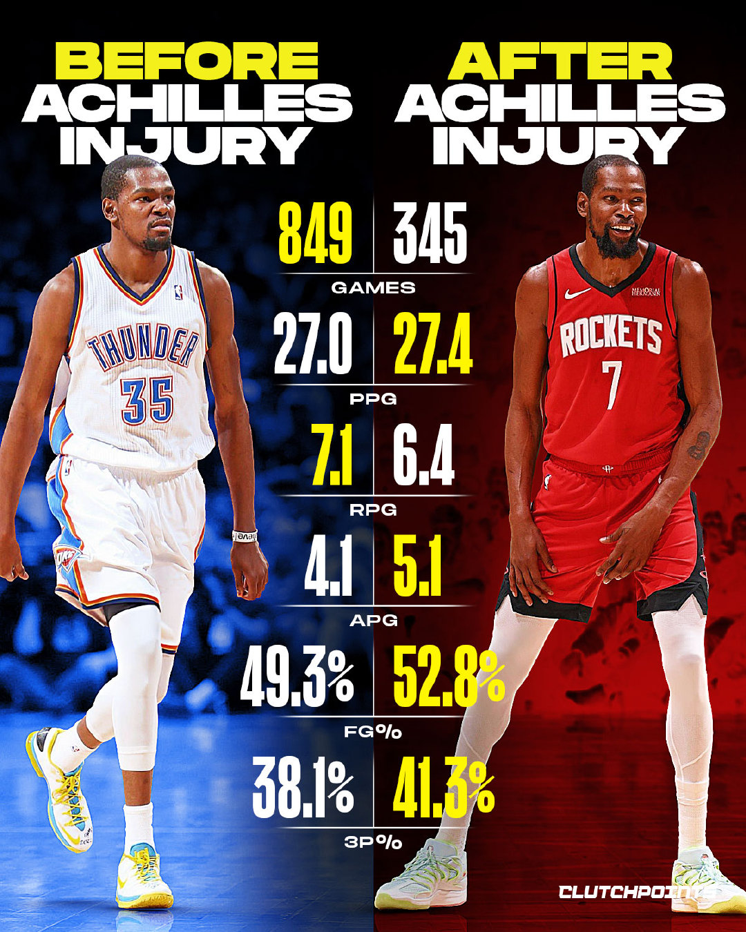 杜兰特跟腱伤前场均27分7.1板4.1助 杜兰特受伤后场均27.4分6.4板5.1助