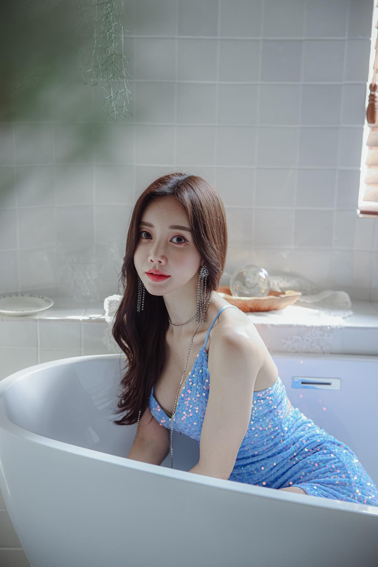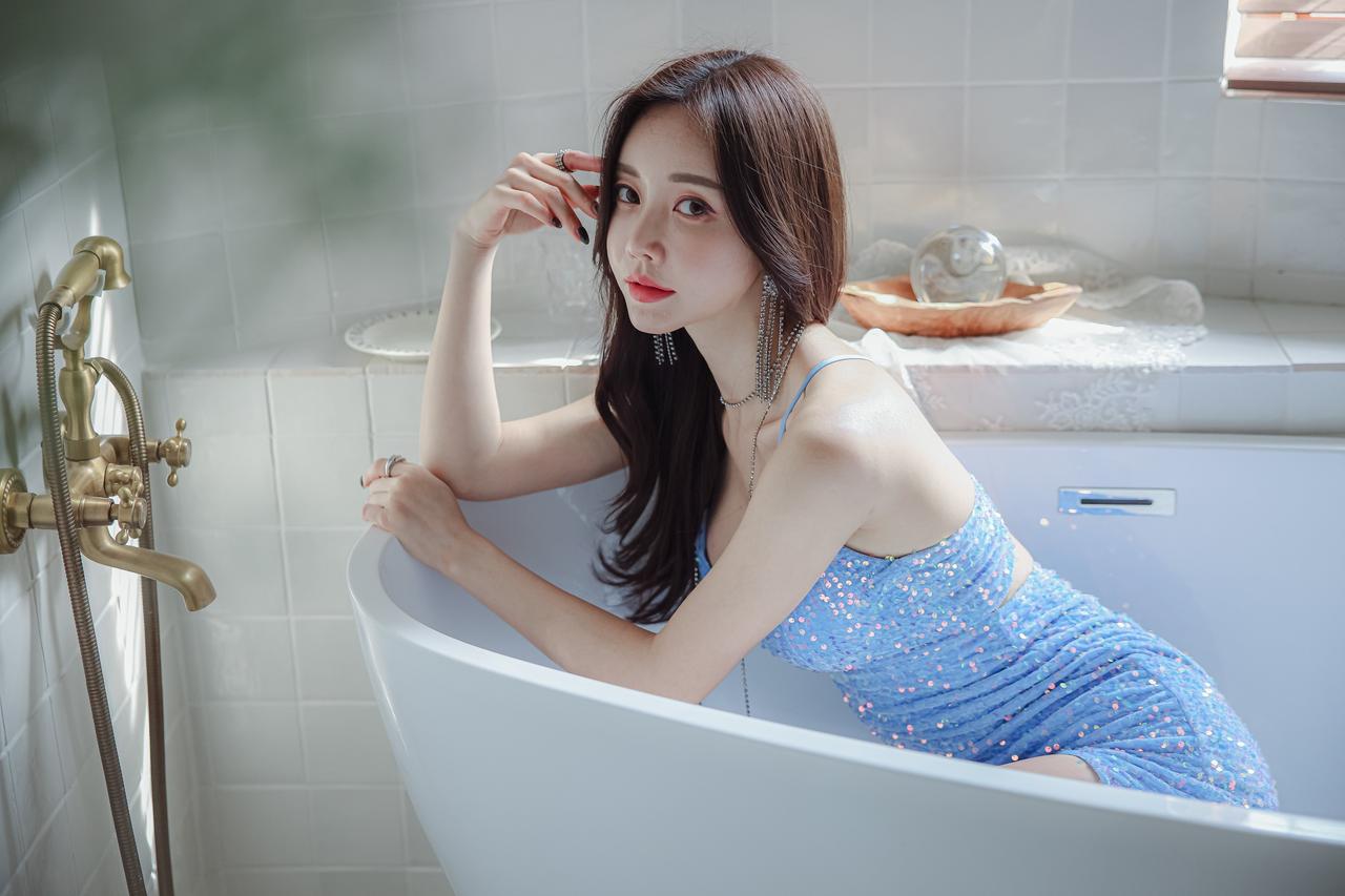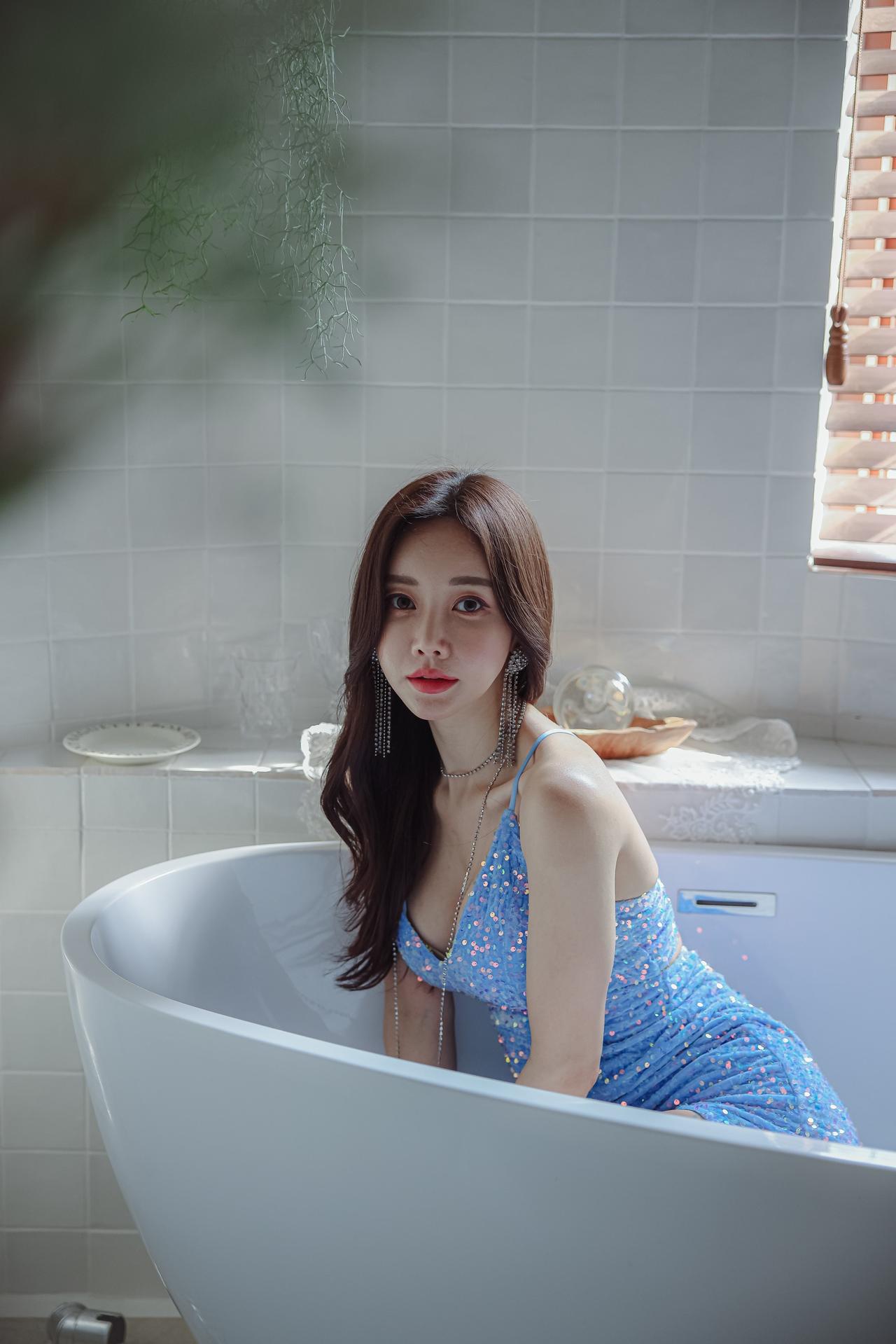 孙允珠穿着蓝色亮片裙的在浴缸里摆姿势写真。