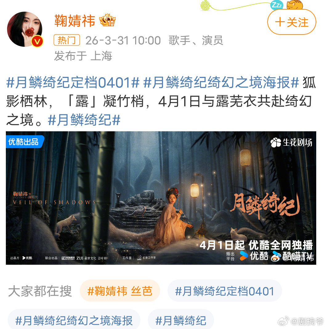 鞠婧祎一边被丝芭举报税务问题,一边官宣自己的新剧月鳞绮纪,明天空降,看不懂了