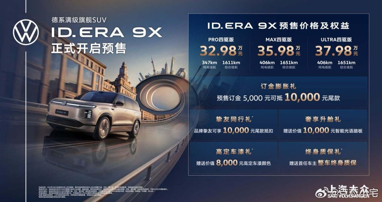 刚刷到上汽大众ID. ERA 9X的预售信息,有点打破我对合资品牌的固有印象了。32.98万起的价格,直接把空气悬架、后轮转向、副驾零重力座椅这些配置全系标配,没有玩“入门版减配、高配版才给”的套路,这点确实挺实在的。
