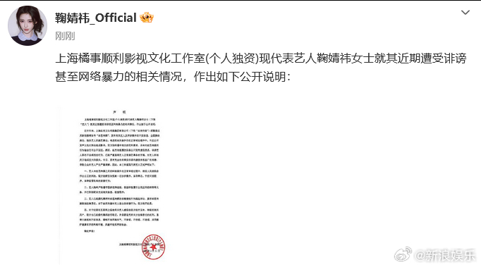 【鞠婧祎工作室回应被实名举报】鞠婧祎要求丝芭传媒承担法律责任31日,鞠婧祎被实名举报偷税漏税。刚刚,鞠婧祎工作室回应称,艺人始终严格遵守国家法律法规,依法积极履行公民应尽的纳税等义务,并已积极配合完成相关抽查、检查程序。艺人已委托律师对丝芭传媒的恶意侵权行为提起诉讼,要求丝芭传媒承担法律责任。 鞠婧祎工作室声明