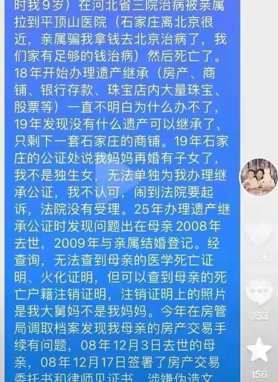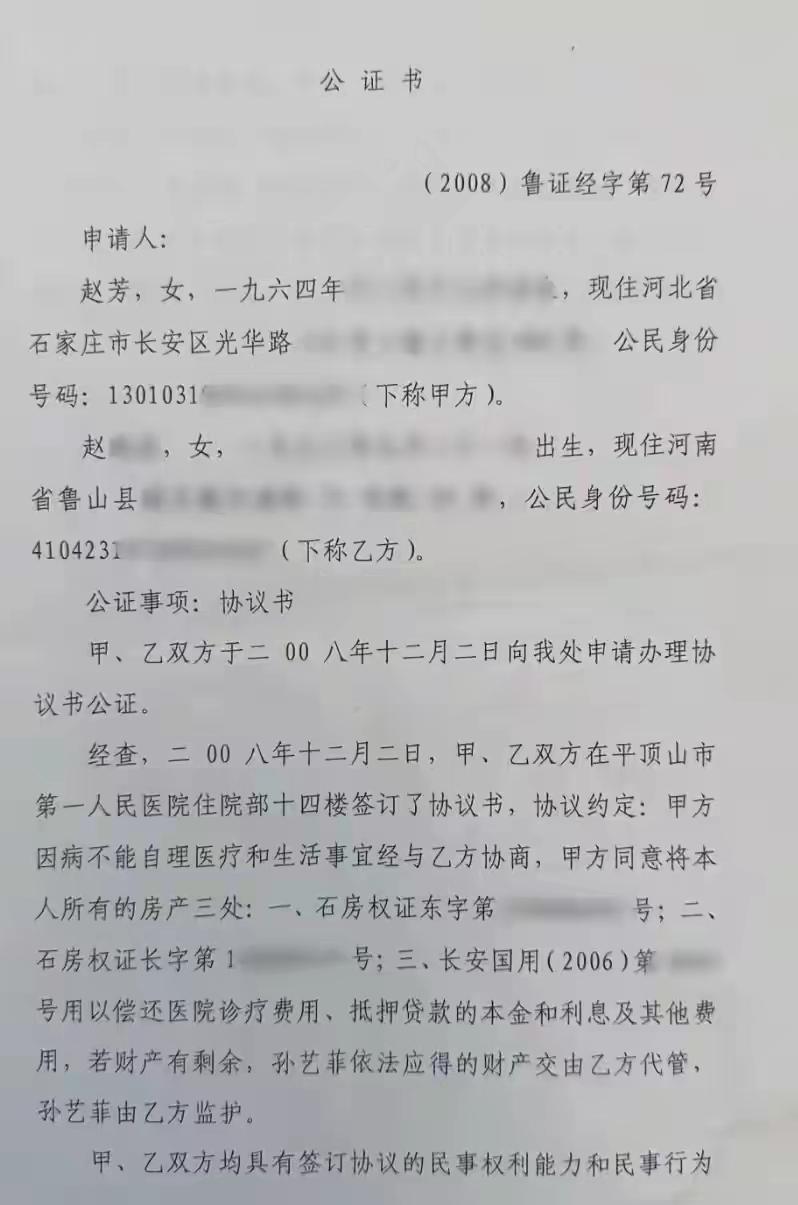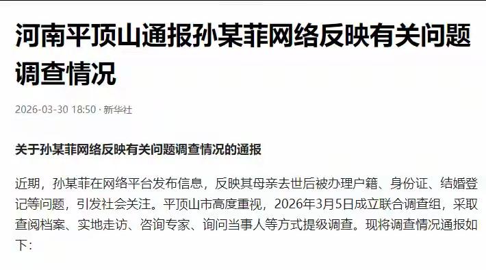 河南鲁山舅舅和亡姐结婚一案查的怎么样了?平顶山市工作组给出结论了:舅舅赵某品🈶违法,但是过了追诉期了,没有侵吞姐姐赵某的财产,孙某菲控告不属实,所以给出了开除党籍,政务撤职严厉处罚!没有开除!!! 孙某菲对于自己继承母亲遗产一事已经找了很多年了,现在不仅是众叛亲离,更是被管控限制,每天打卡签到,她真的错了吗? 不但孙某菲不明白,就连很多网友也是不理解,调查组查出来的信息有很多,为什么大家关心的一些问题没有结果呢? 1、赵某重病去世,和妹妹签订的协议书,12月2日申请公证,12月3日就办理了,然后当天就去世了,写的是赵某有民事和刑事能力,连签字都写不了的人,还有清楚的辨别能力吗?公证处就一个人公证?而且也没有录像录音等证据?这是2008年的12月,应该有吧! 2、孙某菲父母离婚,母亲重病去世,第一监护人应该不是姨妈和舅舅,而是她的亲生父亲,为什么没有把监护权给他的父亲呢? 她的姨妈只有35岁,会平白无故的愿意扶养外甥女?她的大舅赵某品起到了什么作用呢?(孙某菲说过自己爸爸因为舅舅的压力放弃了争夺扶养权)。 3、关于财产问题,查出来赵某只有包括门面房在内3处房产,其实也就是一套住宅楼和储藏室,还有一个21平米的门面房,还有10多万的负债和贷款。 卖房的35万元,除了还债,还有给孙某菲买保险,养她到成年,基本上没有钱了。 那么赵某当年经营的玉器店,就没有一点东西? 孙某菲说的玉器、珠宝、股票和现金哪里去了呢? 4、为什么给赵某“死而复生”? 调查组说赵某品是为了让自己的女朋友享受姐姐赵某的养老金待遇,所以才煞费苦心的办理了姐姐的身份证,最后害怕出事,没有领的太多,只领了1万多,还给了自己的父亲。 为了区区一点点的养老金,一位大领导会冒那么大的风险,闹出和亲姐姐结婚的笑话吗? 赵某品和姐姐结婚的目的是什么呢?这件事怎么没有说清楚呢? 5、孙某菲想要查清楚自己母亲的事情,还有自己遗产归属问题,为什么最后居然成了嫌疑人呢?调查组怎么没有解释呢? 当初孙某菲坚持不把调查权给鲁山县当地,就是怕舅舅的关系在当地太强大,最后不了了之,所以才提级上了平顶山市政法委叫冤,没想到调查结果出来了,很多问题还是一带而过。 就连舅舅赵某品随意办理证件这件事,最后居然也是没啥大事,你让普通人怎么办! 当初有网友就说了,调查组调查期间,人家舅舅赵某品非常自由,看不出一点的异常,而孙某菲天天晒打卡报道的视频,去哪里都要走有监控的地方,太难了! 关键是新华社已经都转载了这个报道,是不是就是最后结果呢?孙某菲还能找到自己想要的答案吗?