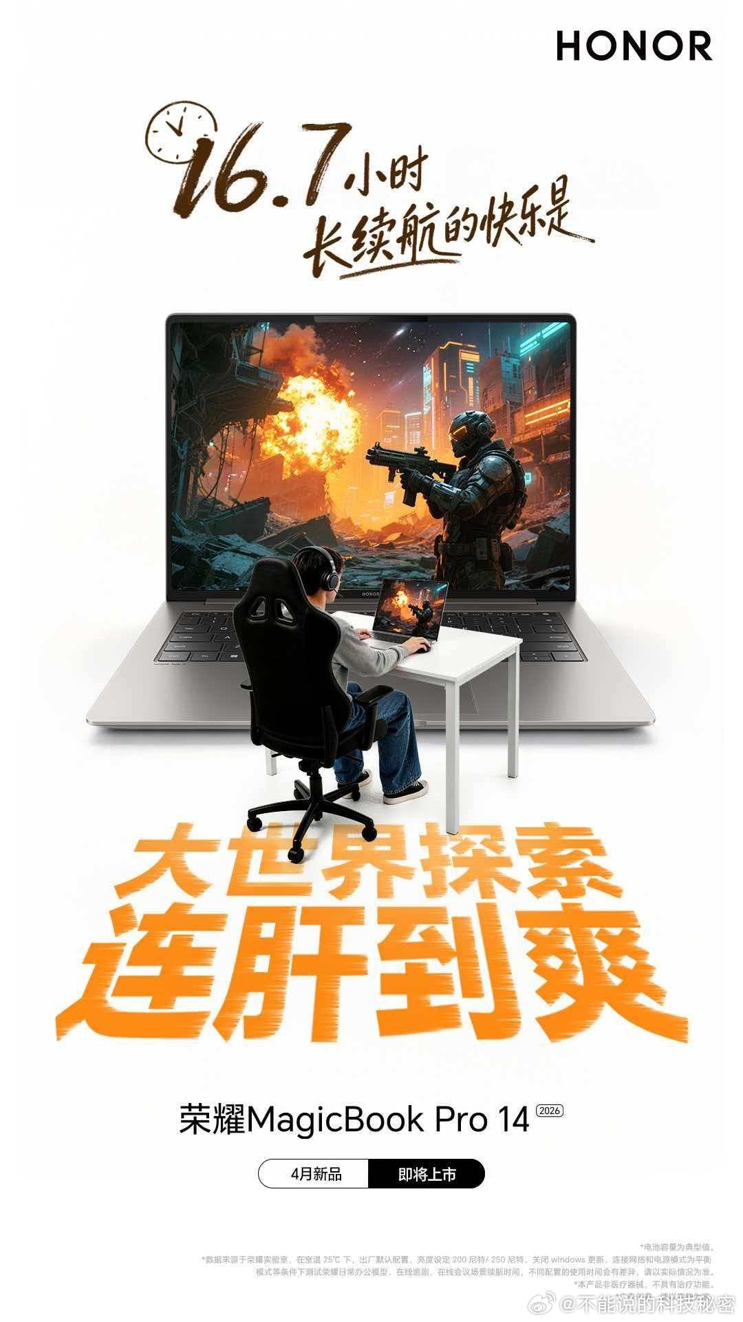 怎么用,都有电!荣耀MagicBookPro14 16.7小时超长续航,快乐直接拉满。游戏局C位,连肝到爽不掉线;一口气刷完30集热播剧,中途不插电;户外学习一整天,无需充电器。大学生的快乐就这么简单!荣耀笔记本 新品4月即将上市,敬请期待!