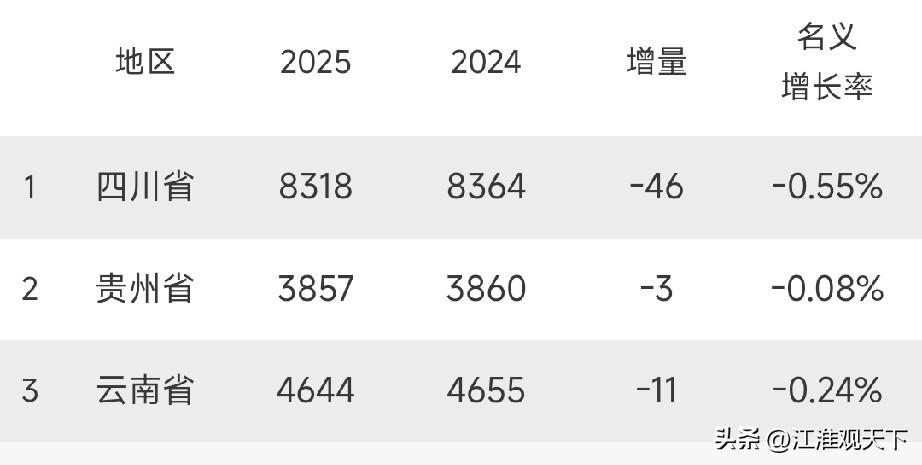 云贵川三省总人口超1.6亿人,三省地理相近,人文相亲 在中国的西南版图上,有三个省,大家喜欢口语化叫它们的简称为“云贵川”,就是云南,贵州,四川三省,因为三省地理相近,人文相亲,饮食习惯,风土人情等等方面非常接近,三省老百姓也互认对方为老乡。 根据云南,贵州,四川三省统计部门发布的数据,2025年末四川常住人口8318万人,同比减少47万人,贵州省常住人口3857万人,同比减少3万人,云南省常住人口4644万人,同比减少11万人。 云南省,贵州省,四川省,三省常住人口合计超1.6亿人。中国人口地图 各省市人口 云南政区图 云南民族人口 云贵gdp 云南民族人口 云贵风土人情 云贵川渝人之家 多来云贵川