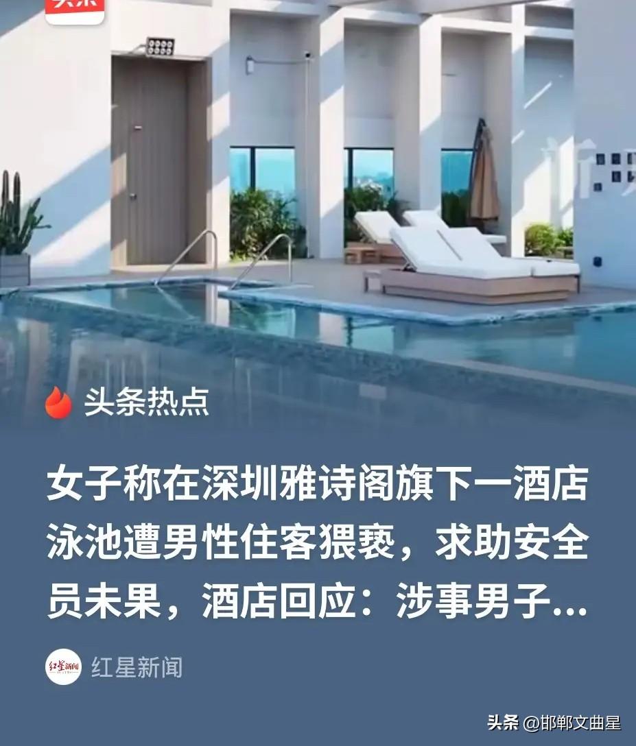 炸裂!女子泳池遭男子后抱猥亵,事后男子还叫嚣,我拍到你游泳照片了! 3月25日深圳某酒店泳池发生恶劣猥亵事件,细节曝光让人血压飙升! 女住客华女士在泳池游泳时,突然,一名陌生男子以调整泳镜为借口刻意靠近,然后趁其不备突然从身后强行抱住她,对她上下齐手,举止猥琐不堪,甚至嚣张宣称在水下拍了她的游泳照片。 泳池水深1.4米,当时,华女士担心被拖拽溺水,只能强忍恐惧不断后退躲避,第一时间用微信向现场安全员发消息求助:“他抱我,我很害怕,快过来”,可安全员却没有及时到场,直到猥亵男子扬长而去,才慢悠悠现身。 事发后华女士果断报警,警方调取证据、核实案情后,依法对涉事男子作出行政拘留8日的处罚。 针对安全员严重失职,酒店甩锅称其为实习生,目前已终止实习关系,关于赔偿事宜表示需等待第三方责任划分。 公共泳池本是休闲放松之地,却成不法之徒的作恶场所,安保形同虚设更让人心寒! 通过这件事也提醒广大女性,去泳池游泳一定要选择有安全保障的泳池,游泳时要有同伴,更不要单独到无人角落处游泳。 对此,大家怎么看?