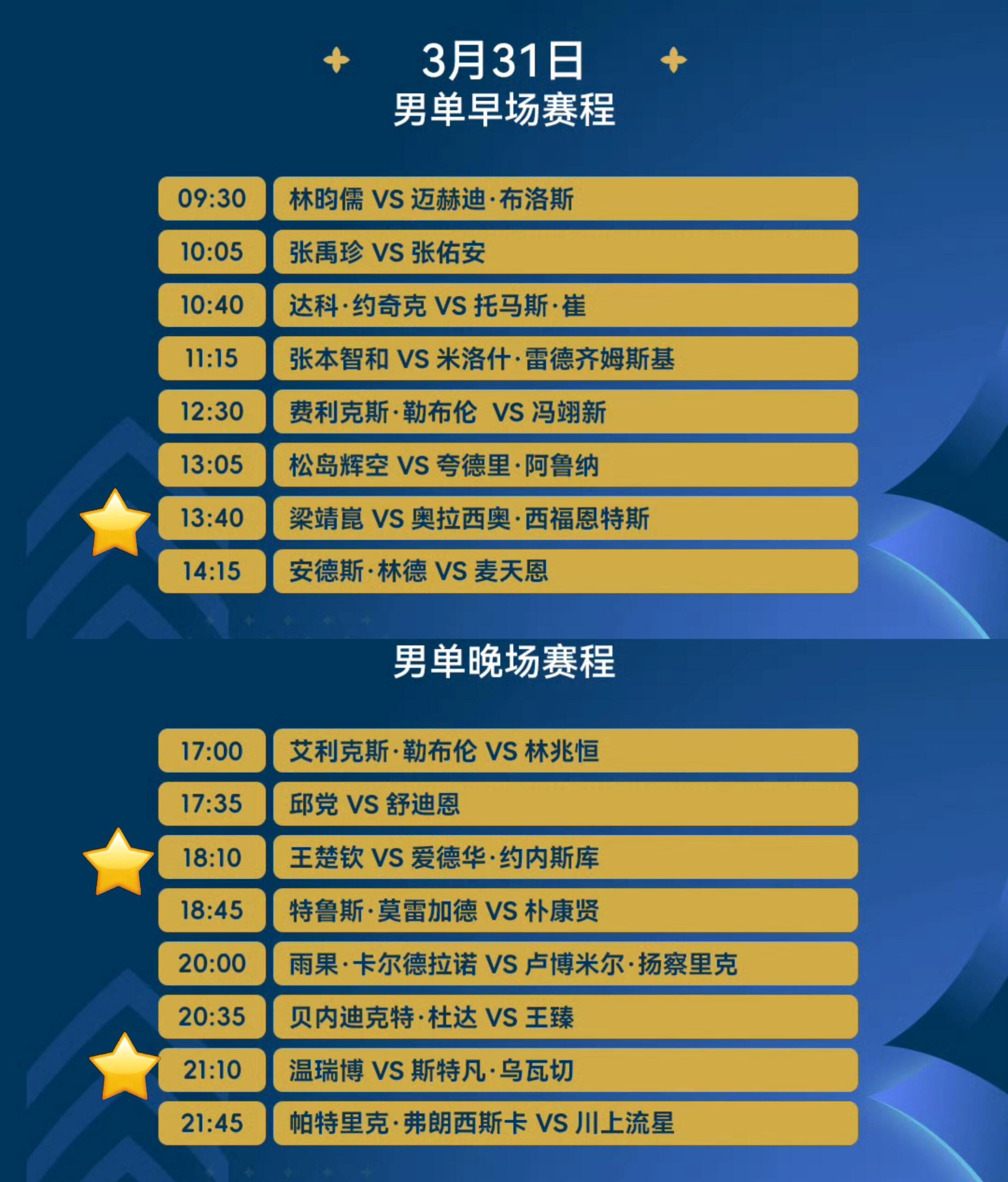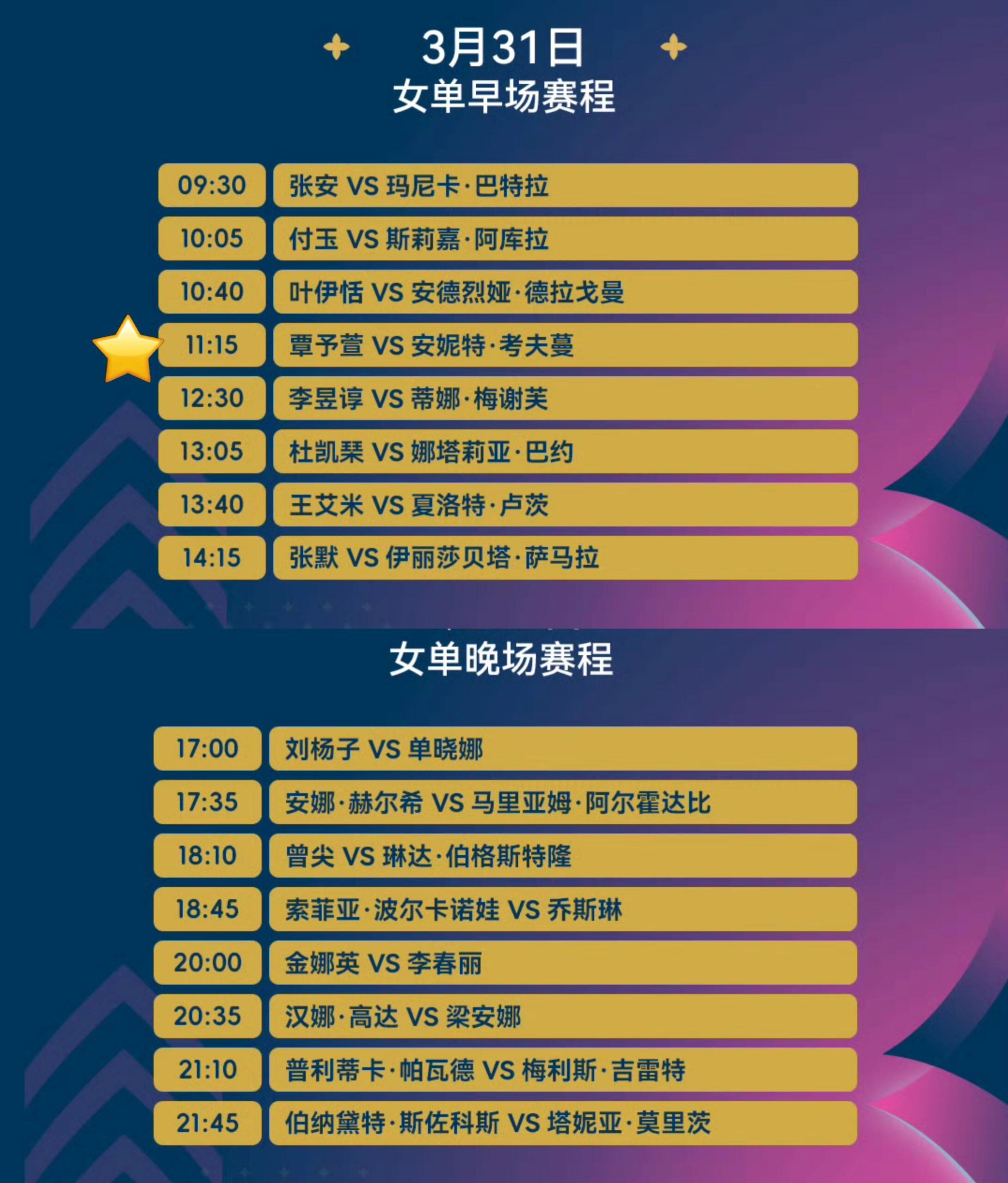 早场:11:15 T1 覃予萱VS考夫蔓13:40 T1 梁靖崑VS西福恩特斯晚场:18:10 T1 王楚钦VSA·约内斯库21:10 T1 温瑞博VS乌瓦切