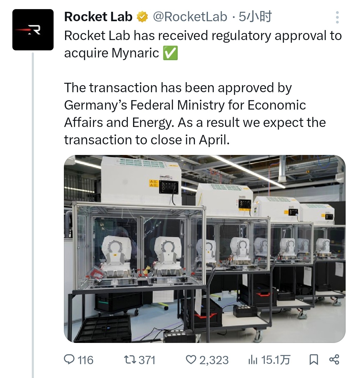Rocket Lab官宣正式通过德国政府审查,批准收购全球著名激光通信终端制造商Mynaric,这项交易最快将于4月份完成