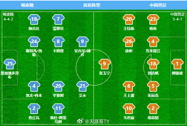国足vs喀麦隆/国足vs喀麦隆首发 中国男足首发:1-颜骏凌;2-胡荷韬、4-吾米提江、5-朱辰杰、18-刘浩帆、23-杨希;20-王钰栋、6-王上源、26-徐彬;10-韦世豪,9-张玉宁。国足