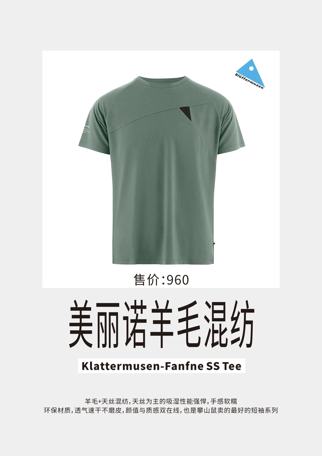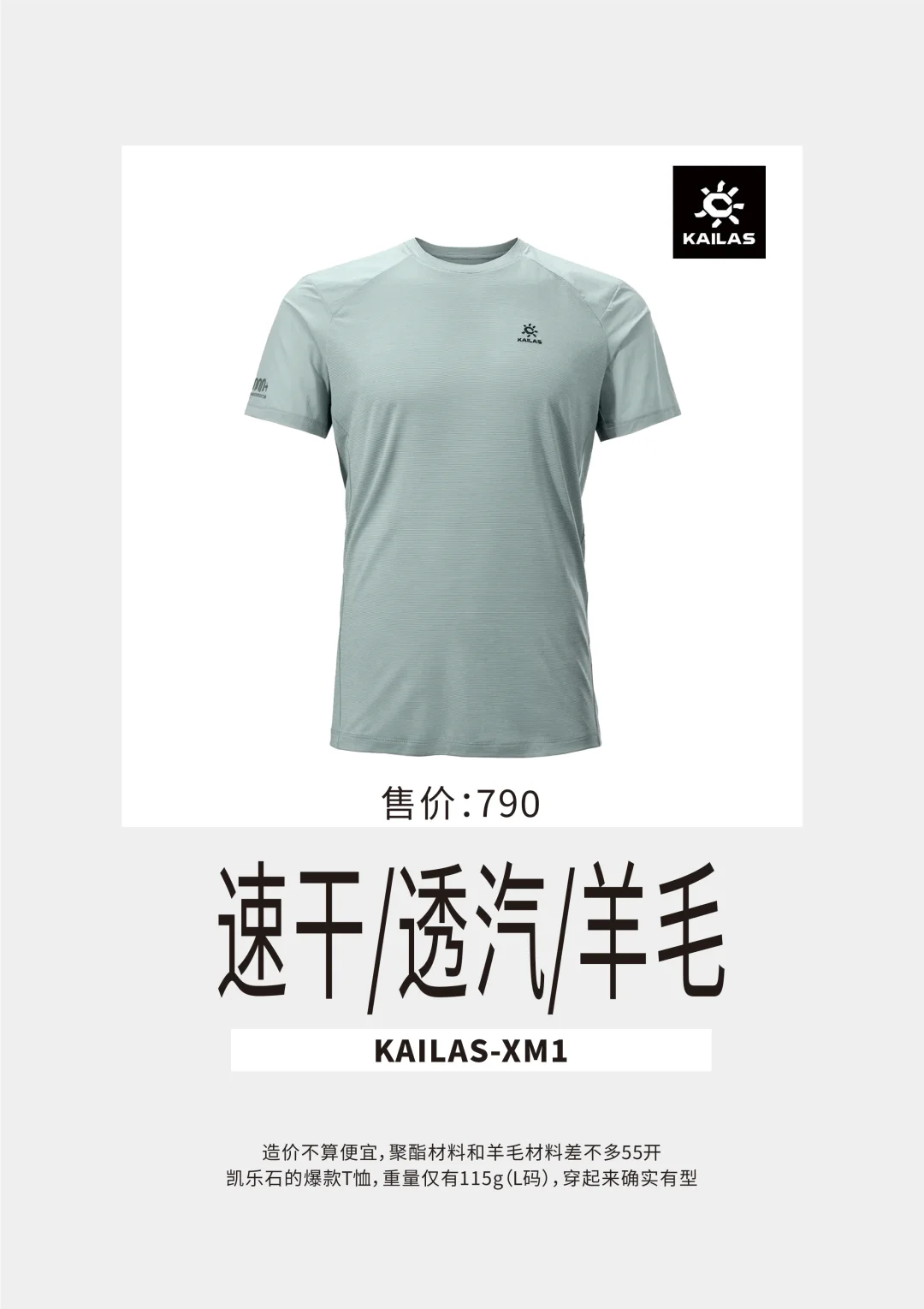 造价不算便宜,聚酯材料和羊毛材料差不多55开,凯乐石的爆款T恤,重量仅有115g(L码),穿起来确实有型